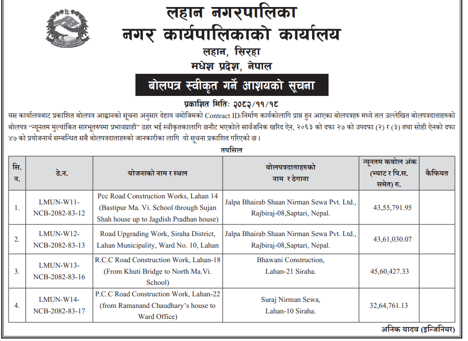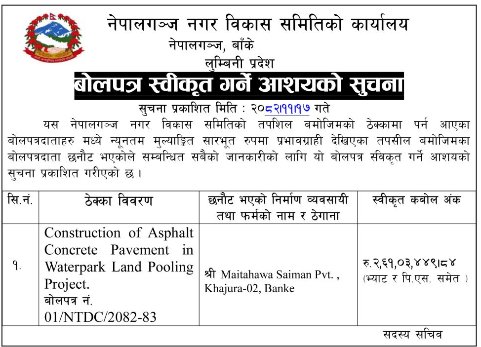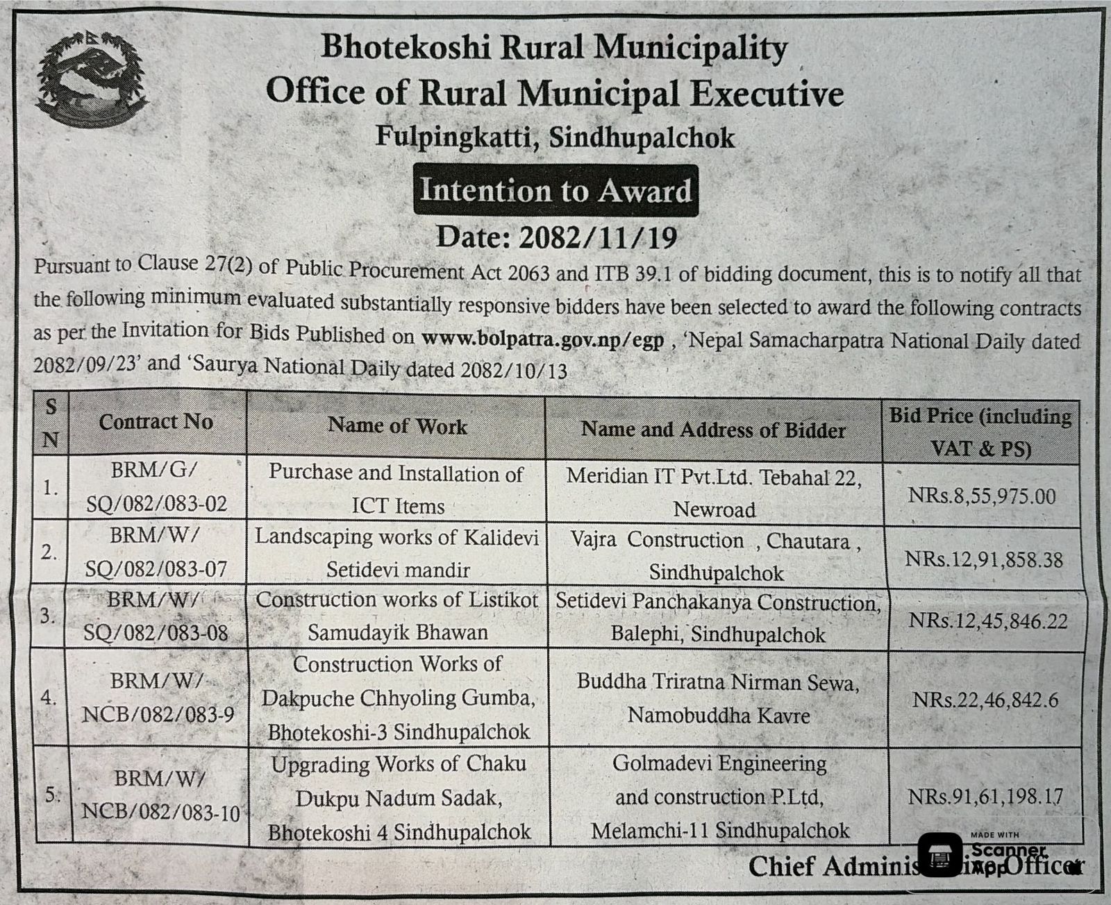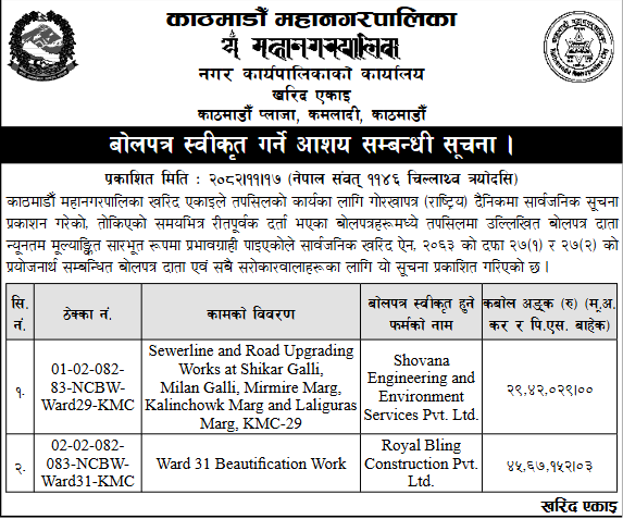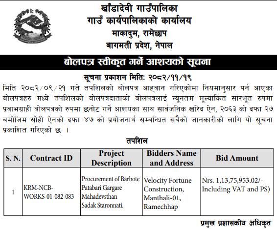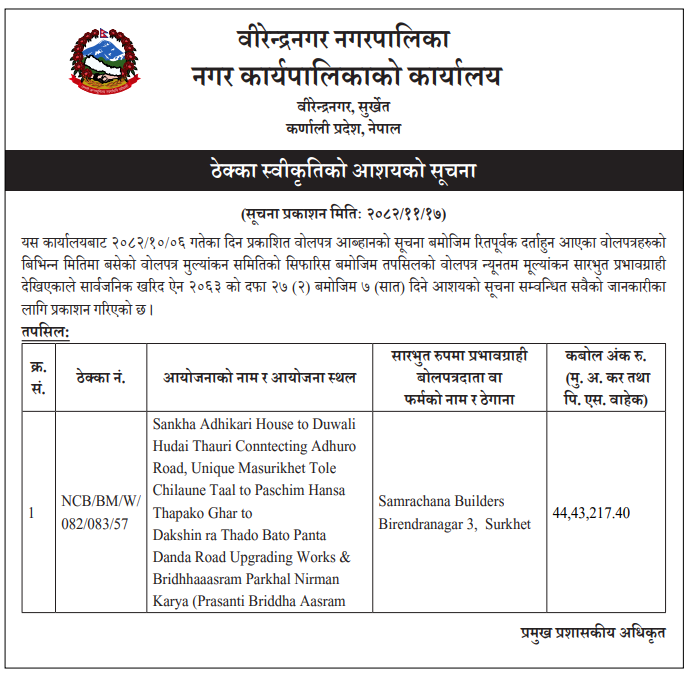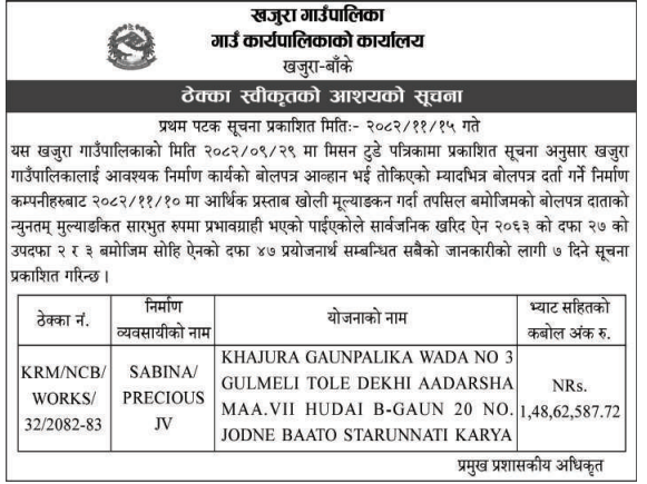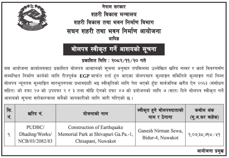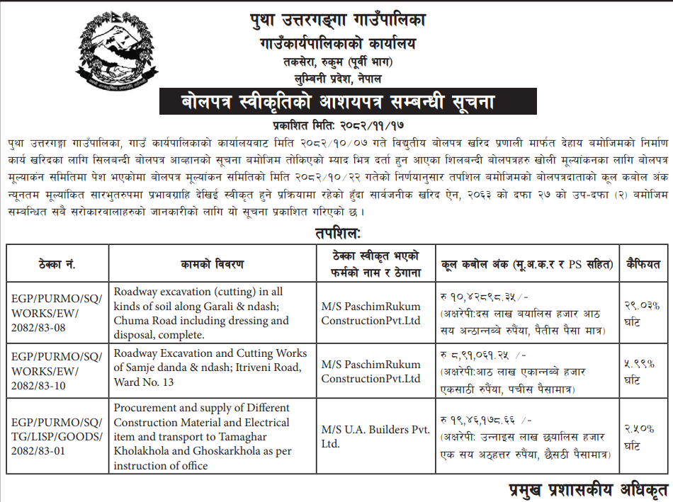 - Award Notice : Road Upgrading Work At Various Places (Swornikita Construction and Suppliers, Gatishil-Gravity JV) |