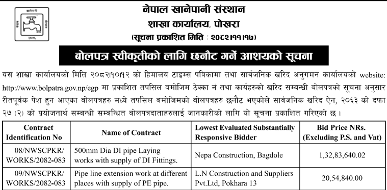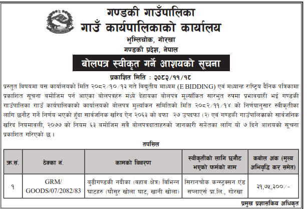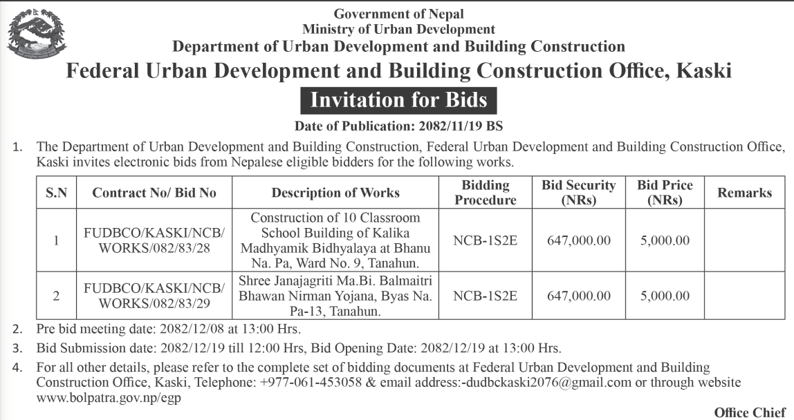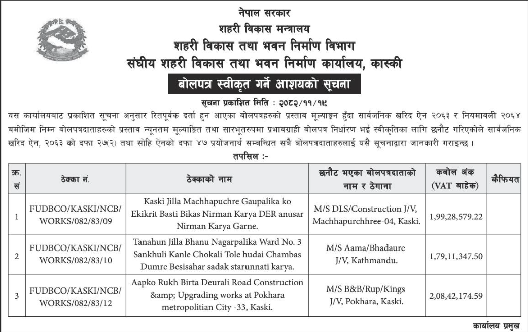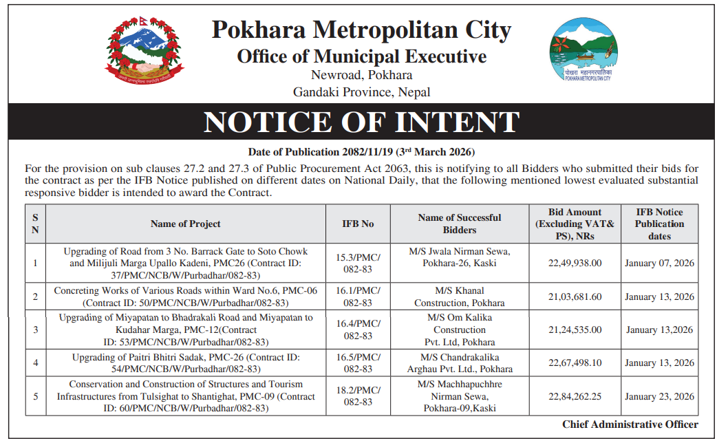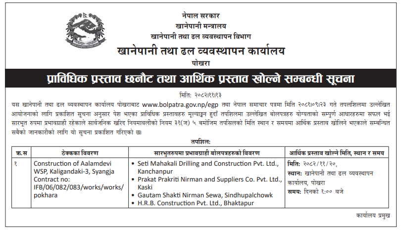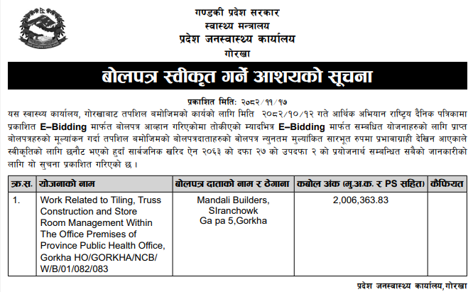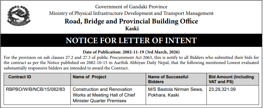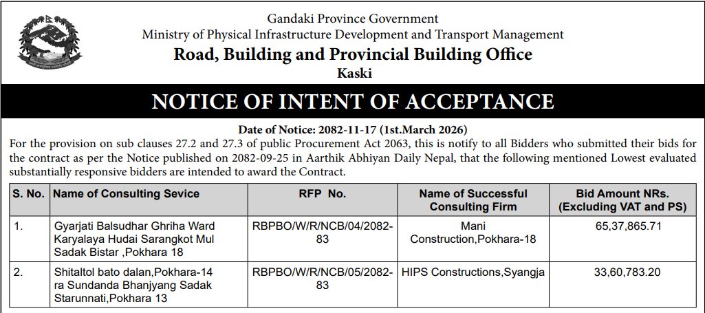 प्रदेश ४ मा प्रकाशित निर्माण सम्बन्धी बोलपत्र तथा आशयका सुचनाहरु