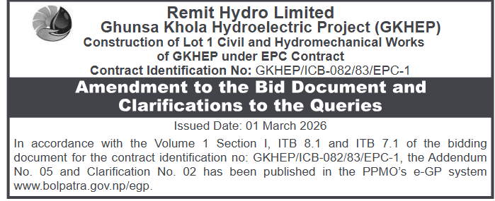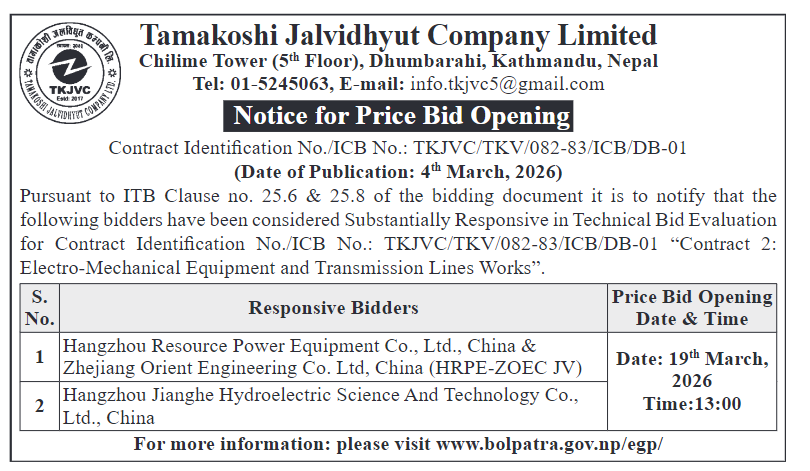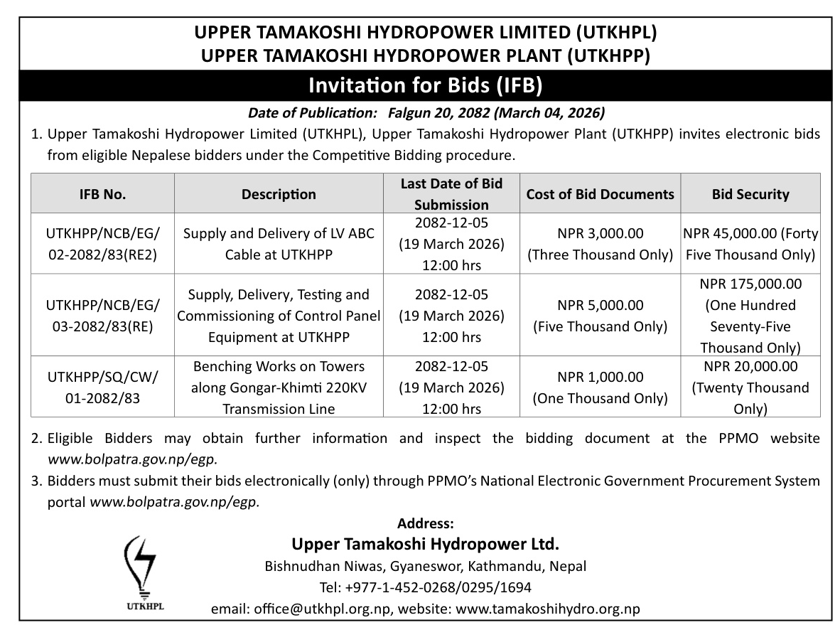 | 1 | Upper Tamakoshi Hydropower Limited | Supply, Delivery, Testing and Commissioning of Control Panel Equipment at UTKHPP | 04/03/2026 | PPMO | 19/03/2026 | Click Here | |