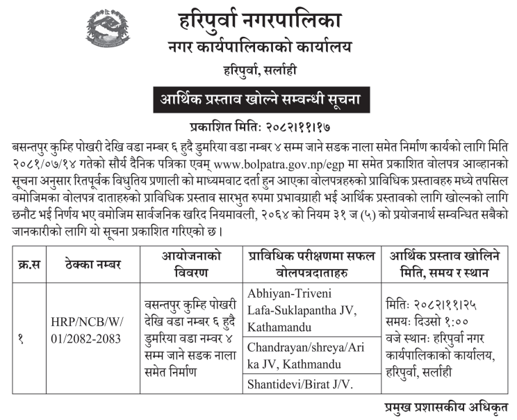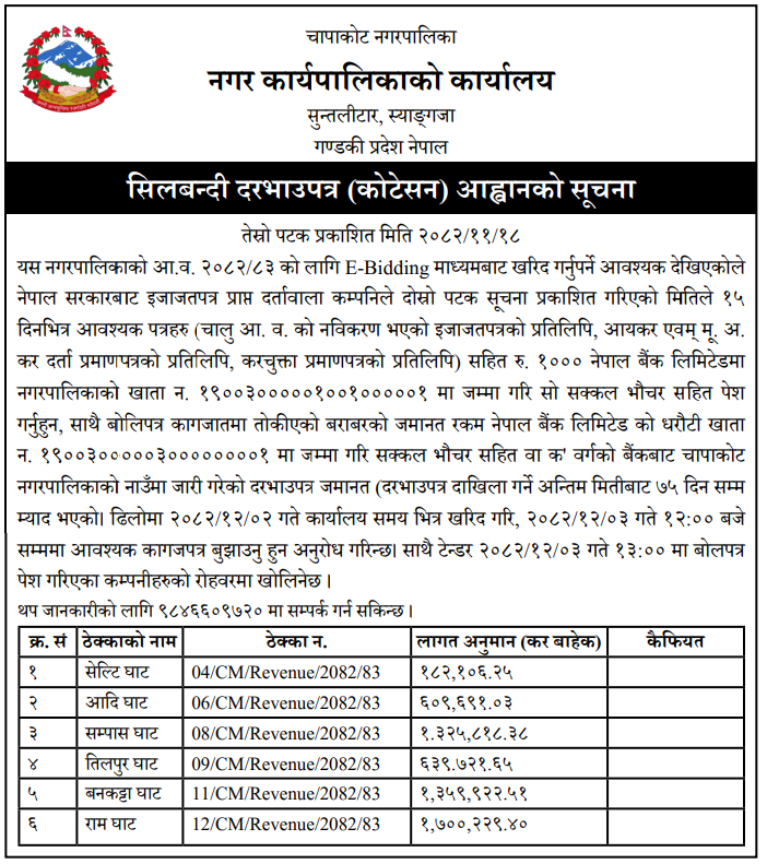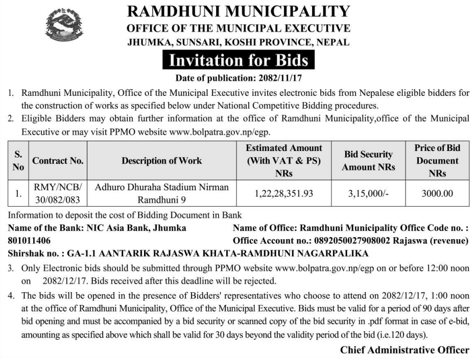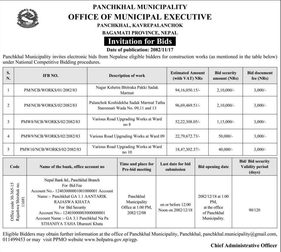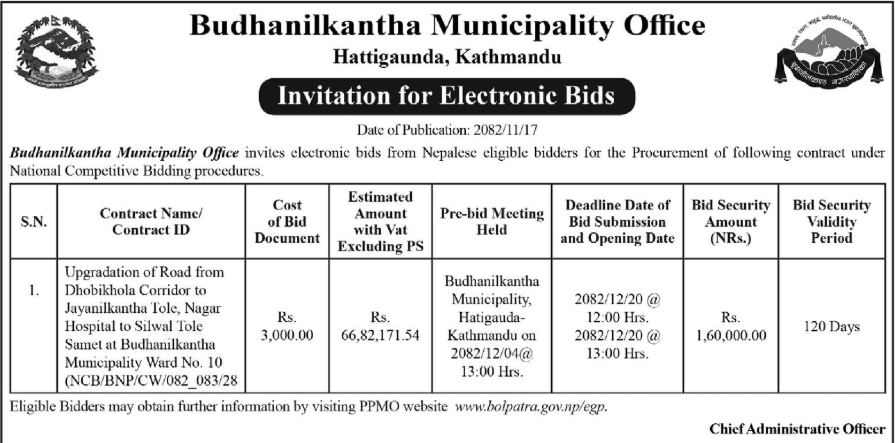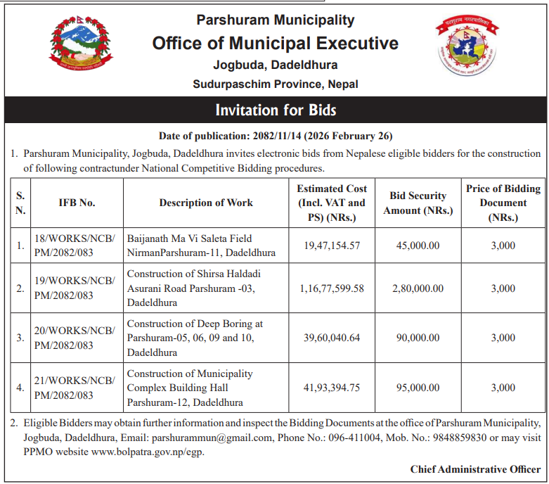 | 26 | Nepal Police Headquarter Procurememt Section, Naxal | Supply and Delivery of Chest Guard | 03/03/2026 | PPMO | 02/04/2026 | Click Here | |