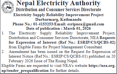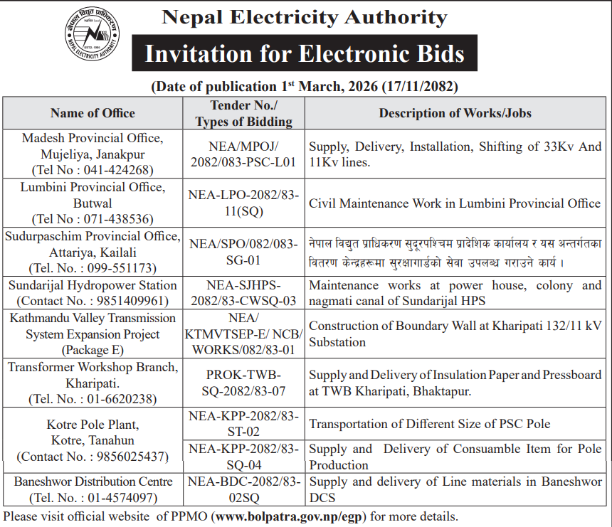 | 34 | NEA, Okhaldhunga Distribution Center | Supply and Delivery of Line Materials & Tools | 03/03/2026 | PPMO | 18/03/2026 | Click Here | |