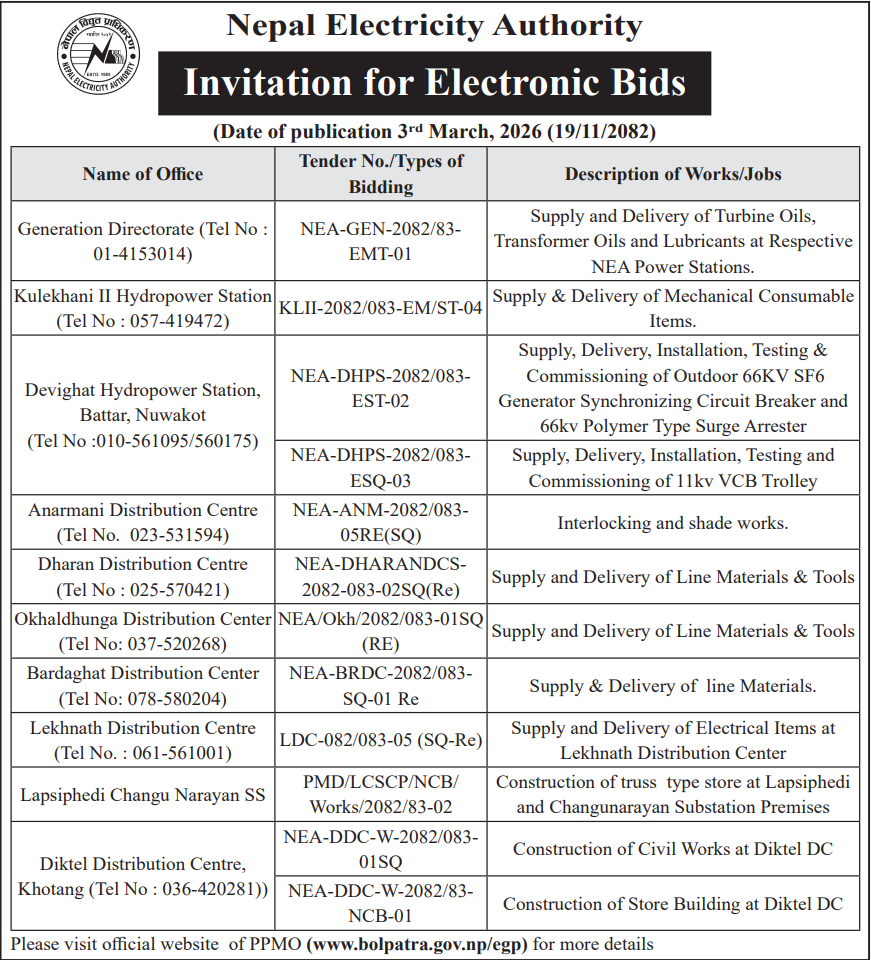 | 35 | NEA, Devighat Hydropower Station | Supply, Delivery, Installation, Testing and Commissioning of 11kv VCB Trolley | 03/03/2026 | PPMO | 18/03/2026 | Click Here | |