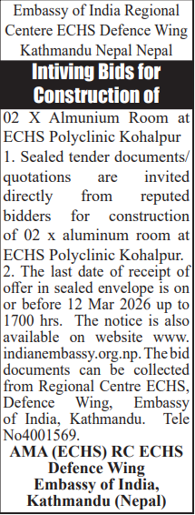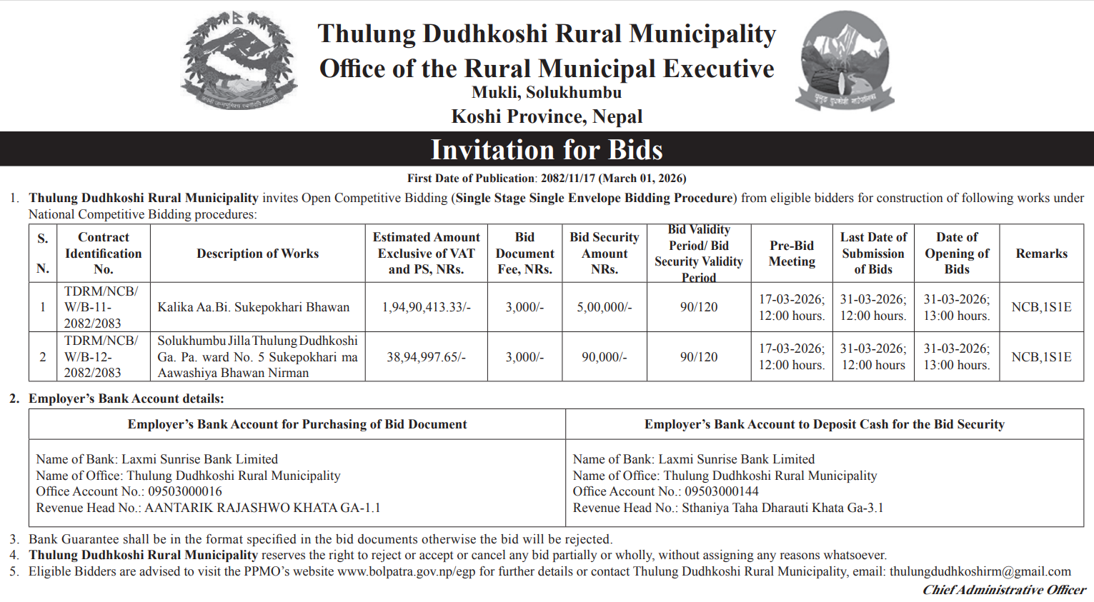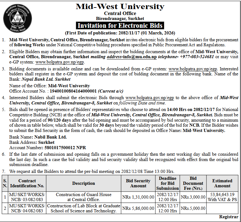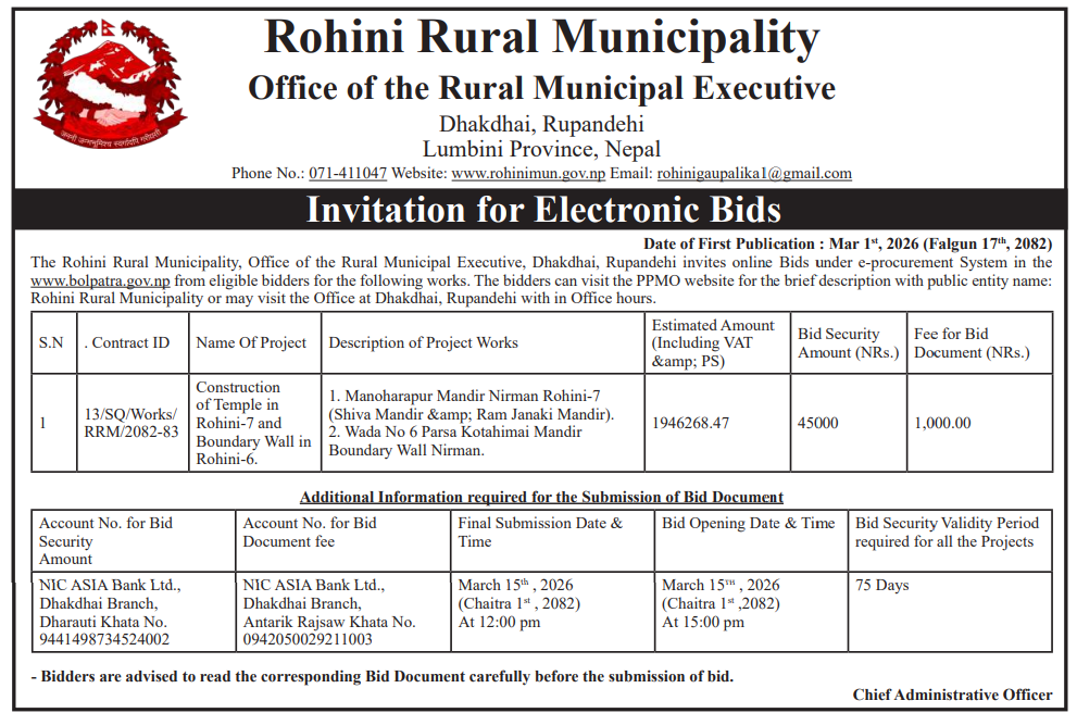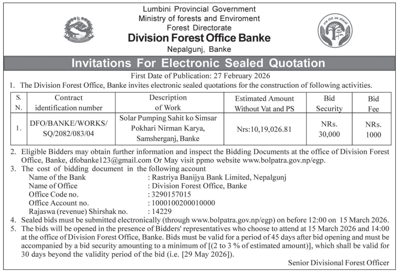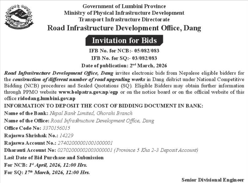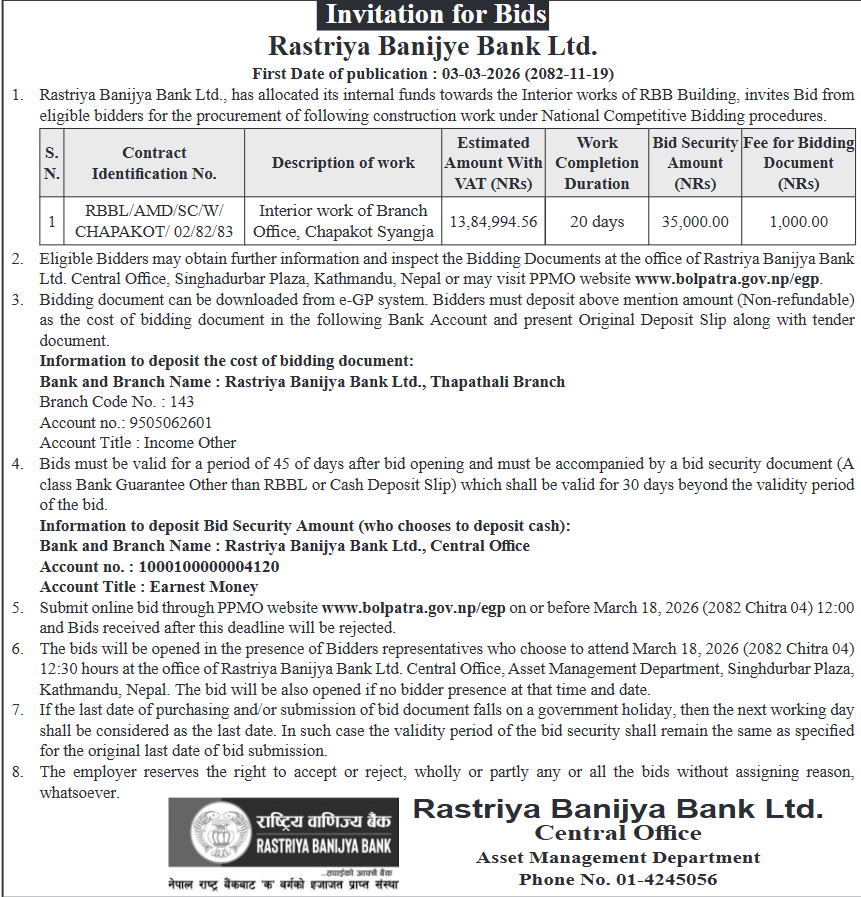 | 42 | Nepal Rastra Bank | Supply, Delivery, Installation, Testing & Commissioning of Split Wall Mounted Inverter Type 1.5 Ton AC – 12 Sets | 03/03/2026 | PPMO | 23/03/2026 | Click Here | |