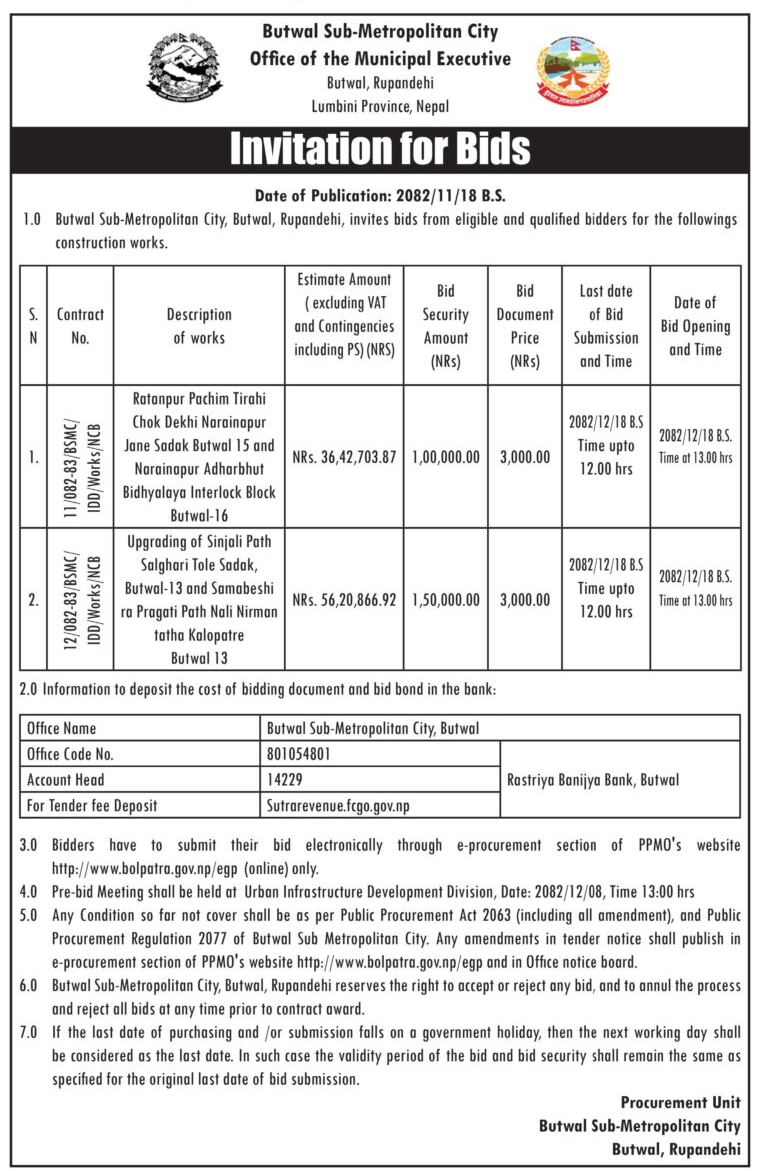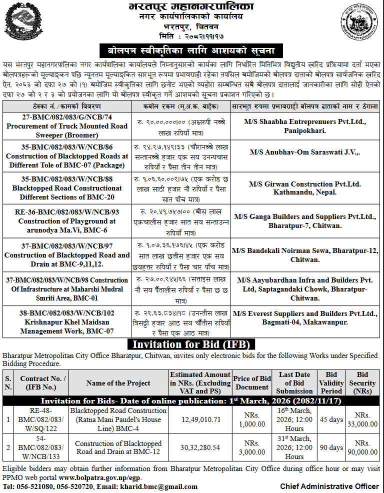 | 38 | Bharatpur Metropolitian City Office | Procurement of Tractor for BMC | 03/03/2026 | PPMO | 18/03/2026 | Click Here | |
