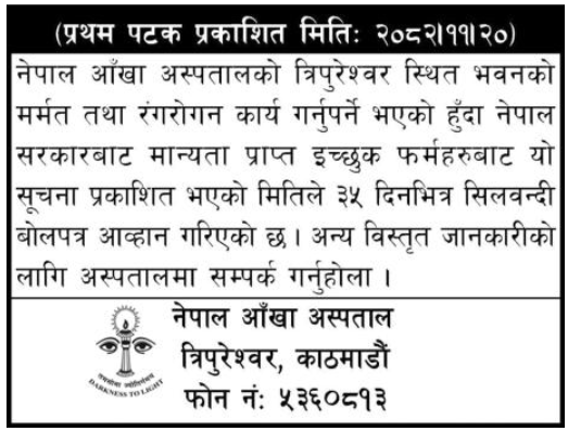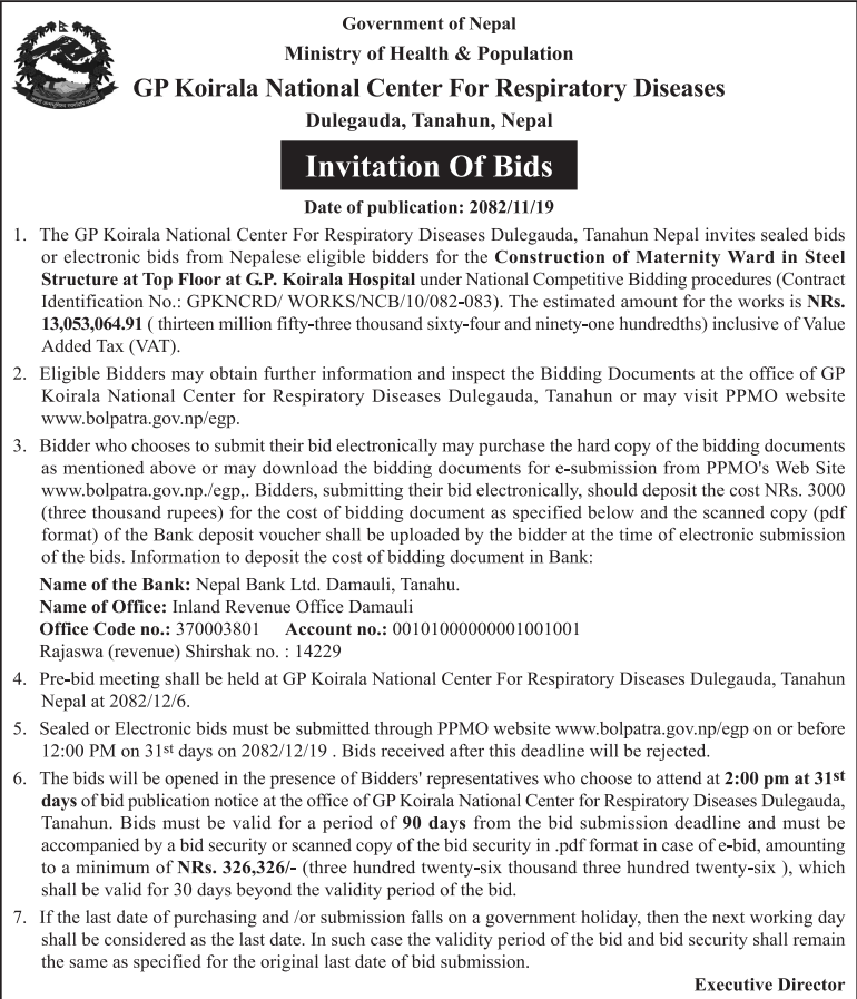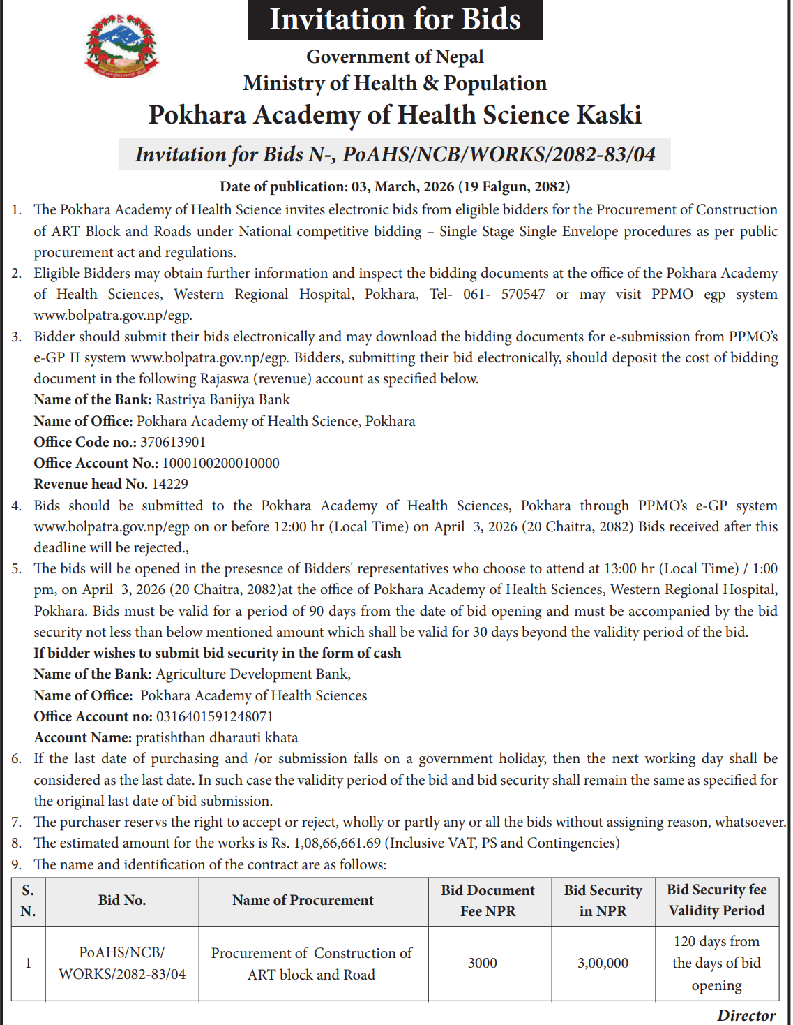 | 45 | Rampur Hospital, Palpa | Procurement of Medicines & Surgical Goods for Hospital Pharmacy | 03/03/2026 | PPMO | 02/04/2026 | Click Here | |