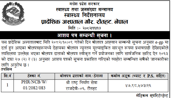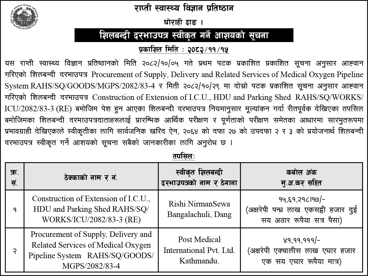| 47 | Rampur Hospital, Palpa | Procurement of Lab Reagents & Chemicals (Close) for Hospital | 03/03/2026 | PPMO | 02/04/2026 | Click Here | |
