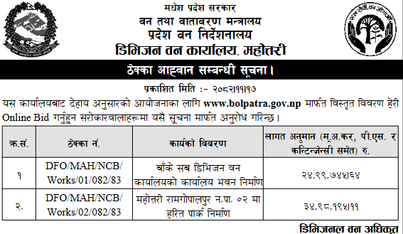 प्रदेश २ मा प्रकाशित निर्माण सम्बन्धी बोलपत्र तथा आशयका सुचनाहरु