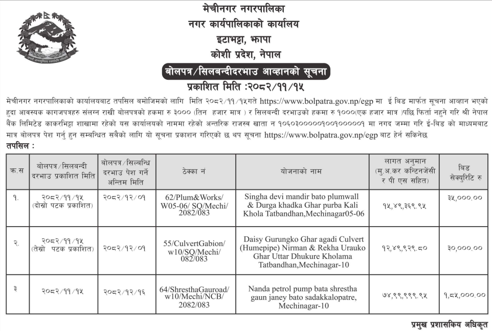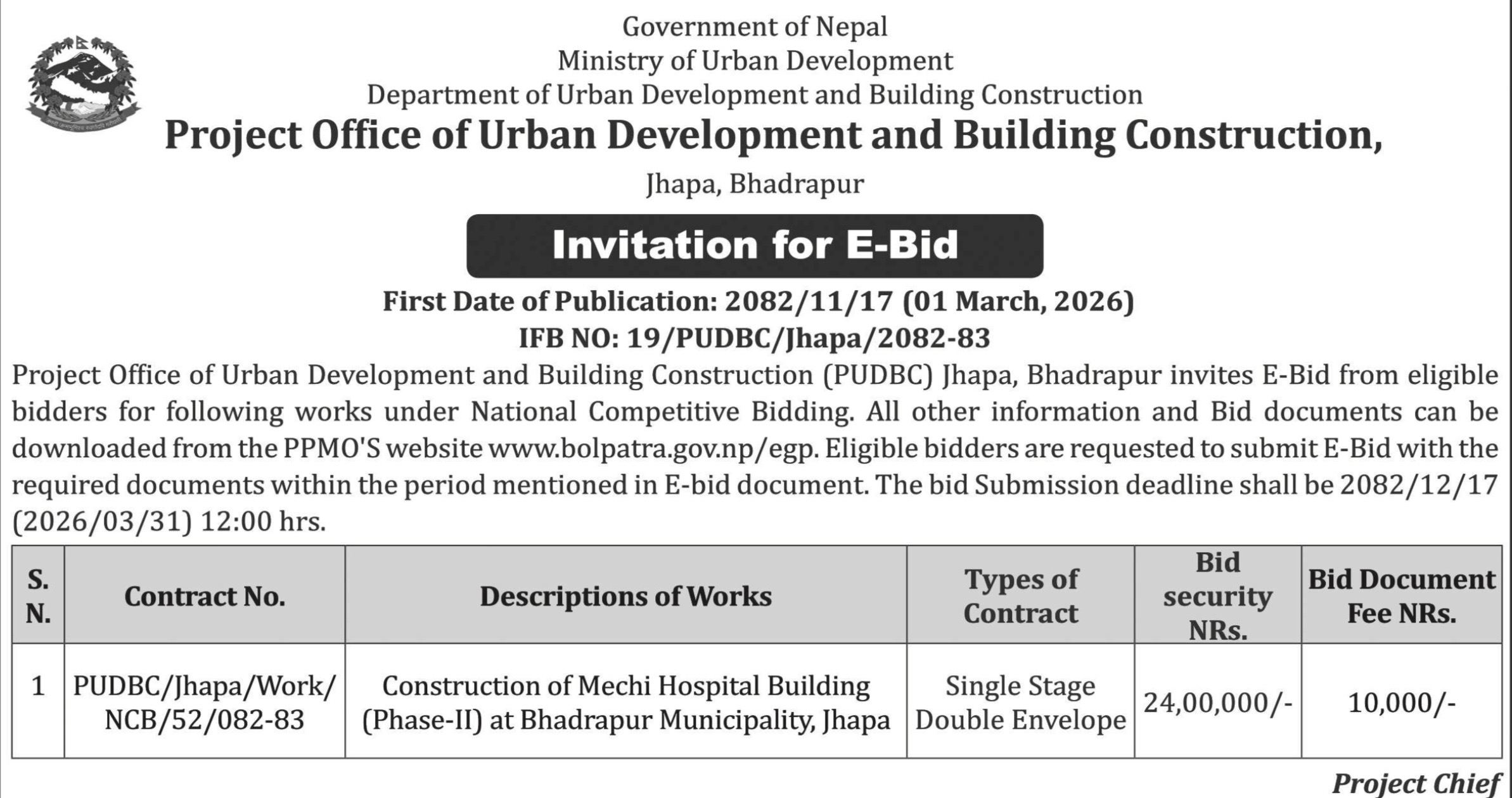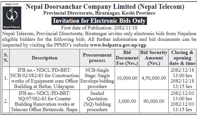 | 13 | NEA, Bhadrapur Distribution Center | LT Line Extension Work at Different Places Of Bhadrapur DCS | 04/03/2026 | PPMO | 19/03/2026 | Click Here | |