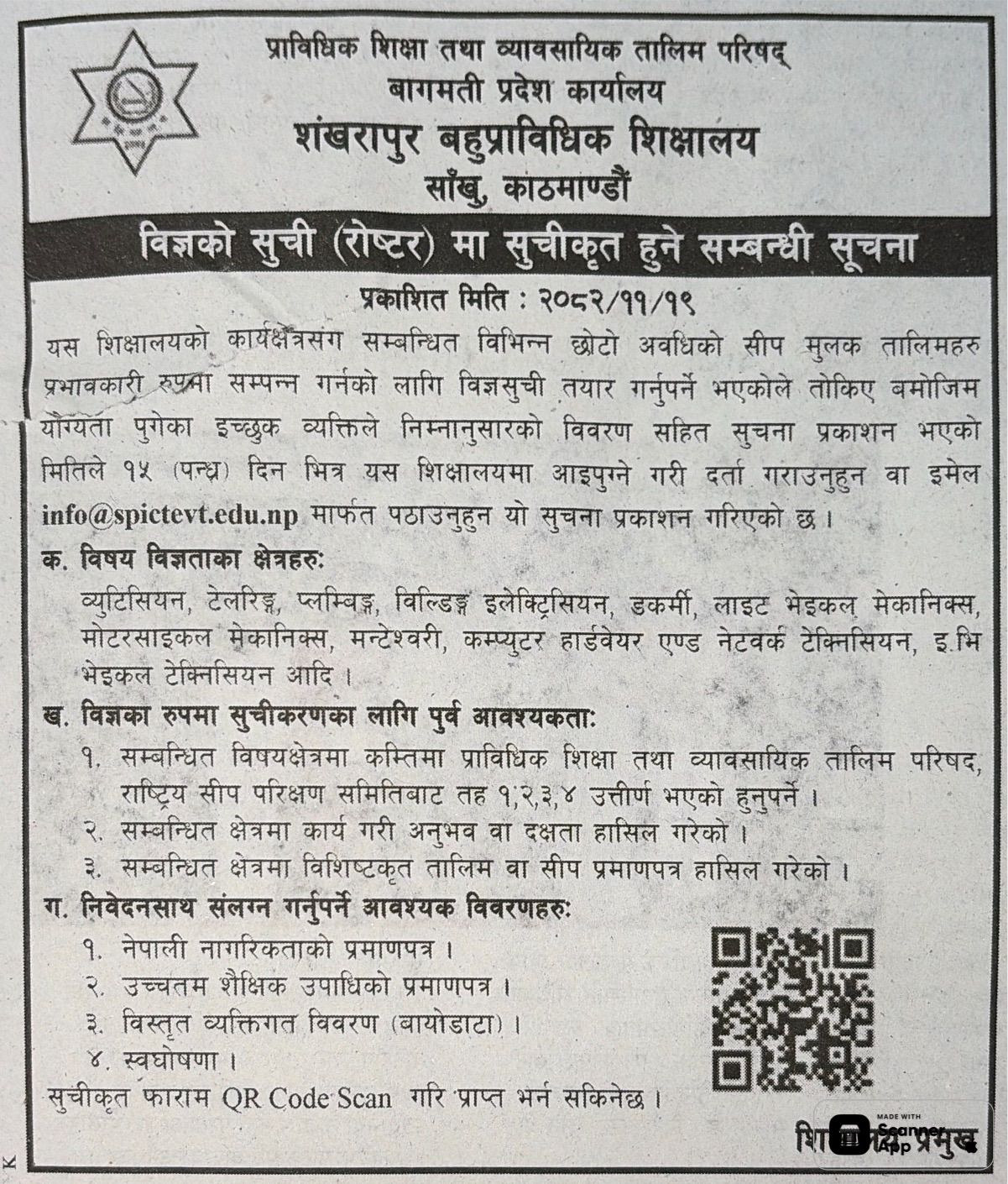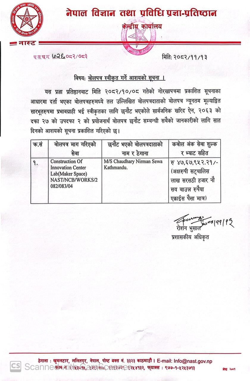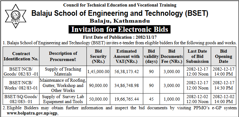 | 41 | National Food Research Centre.Khumaltar | Supply, Delivery, Installation & Commissioning of Distillation Set Pilot Scale | 03/03/2026 | PPMO | 19/03/2026 | Click Here | |