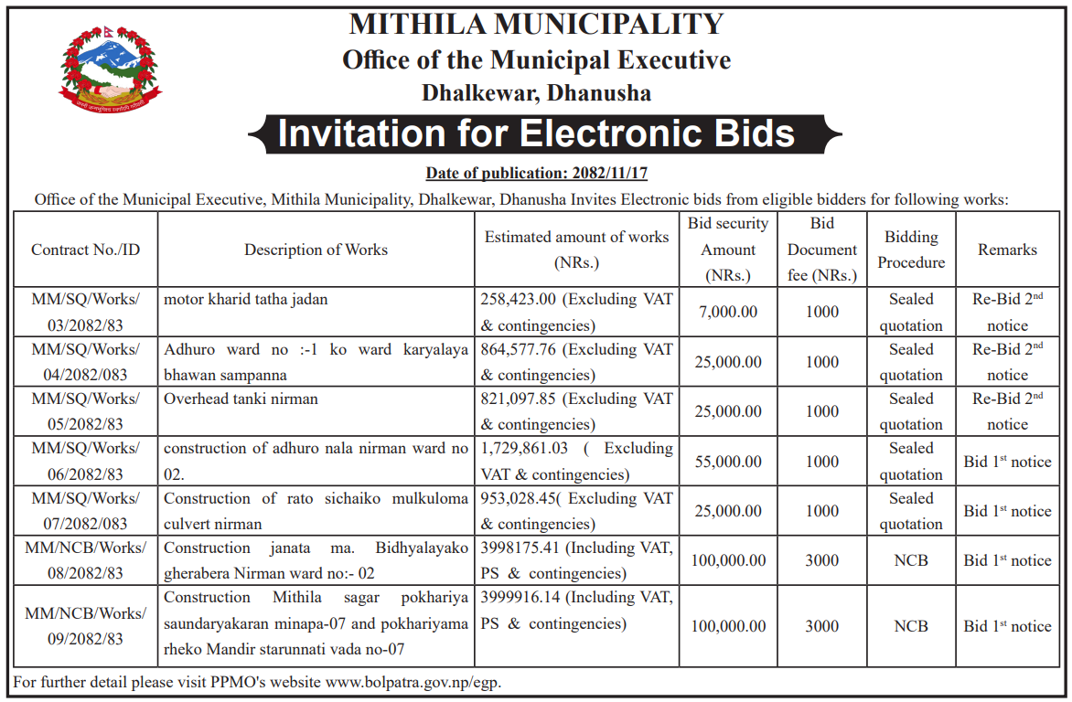 सार्वजनिक खरिद अनुगमन कार्यालय विद्युतिय खरीद प्रणाली EGP मा प्रकाशित बोलपत्रहरु । Bids from electronic procurement (EGP) system, Bolpatra.gov.np/egp