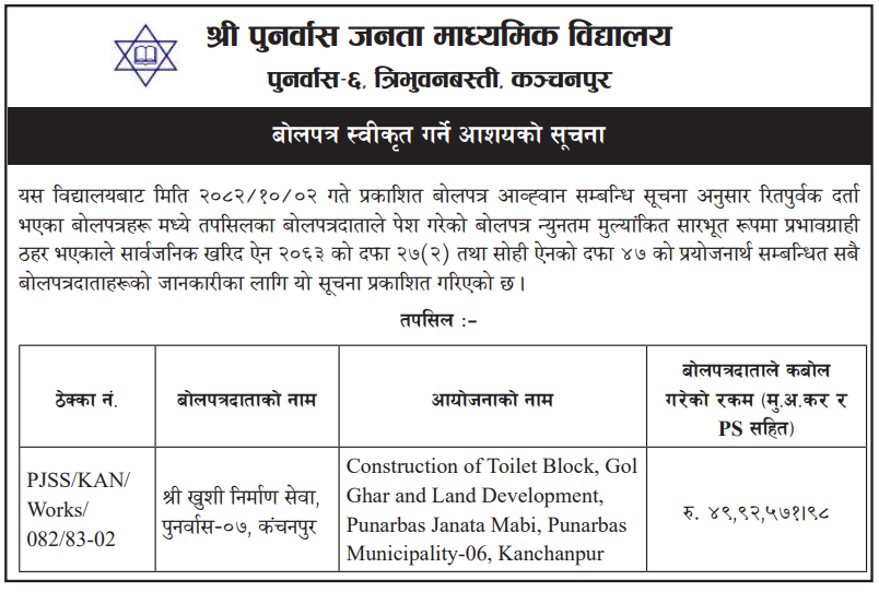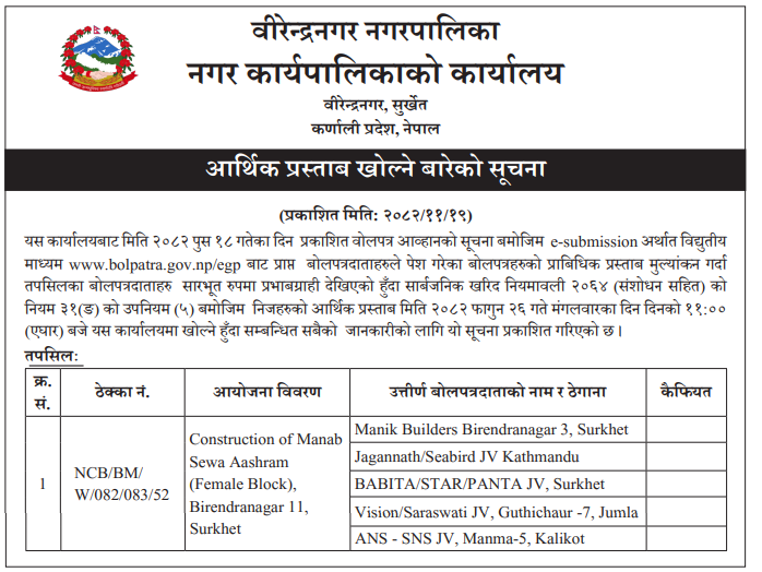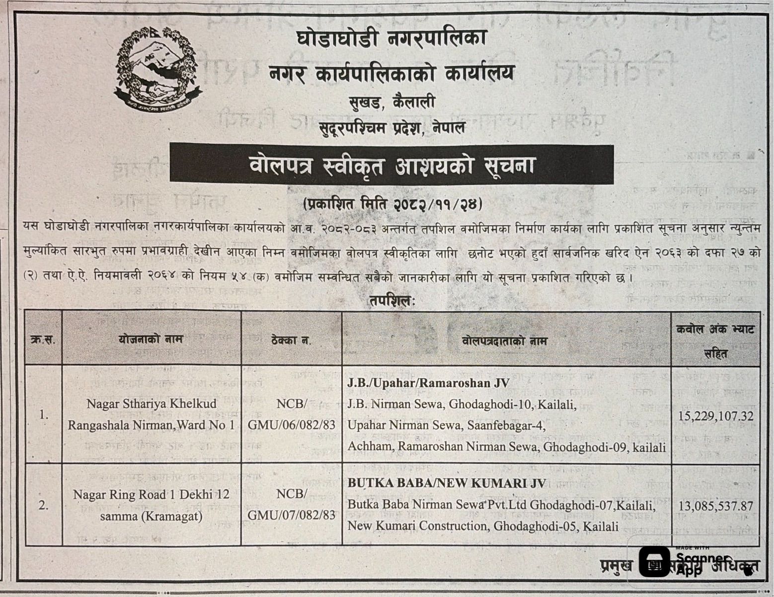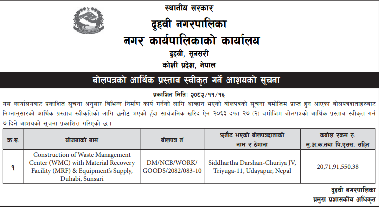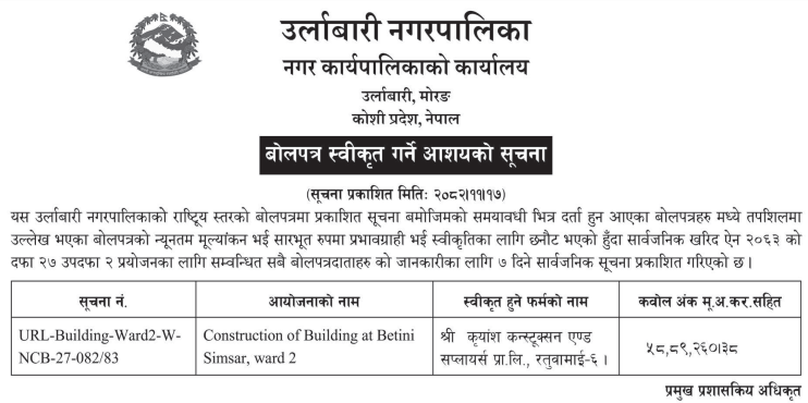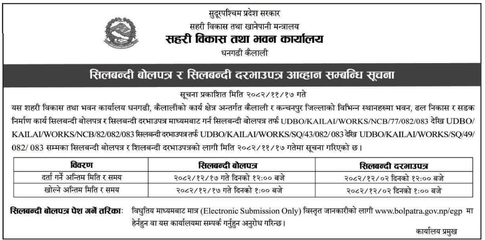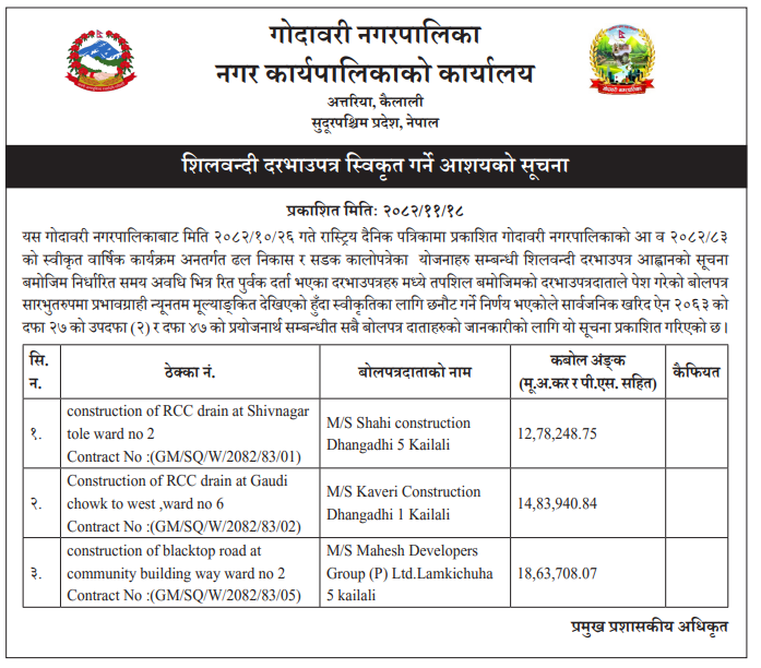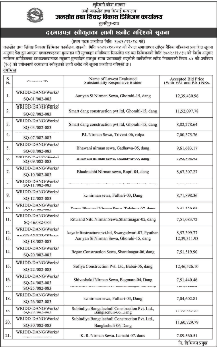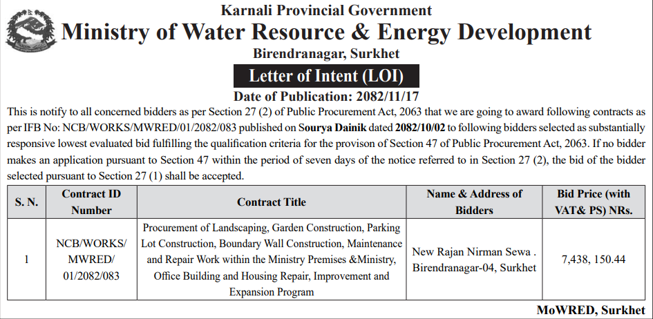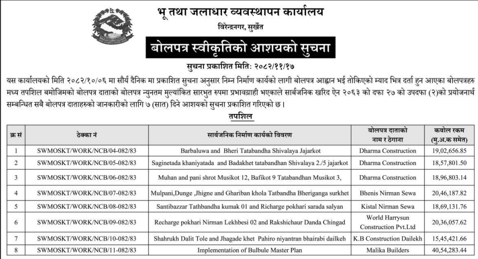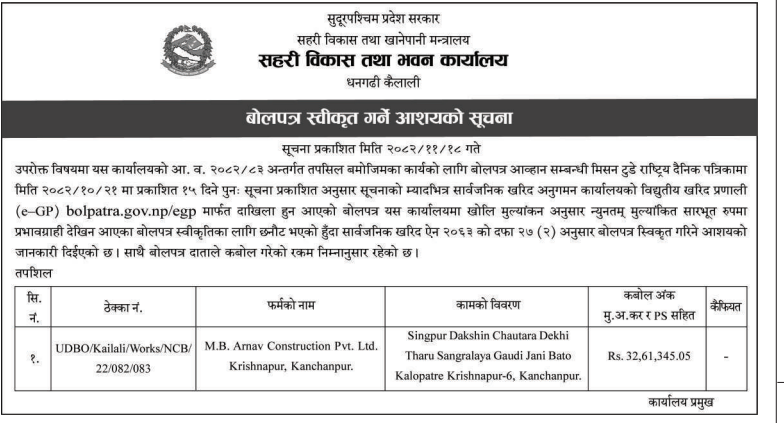 प्रदेश ७ मा प्रकाशित निर्माण सम्बन्धी बोलपत्र तथा आशयका सुचनाहरु