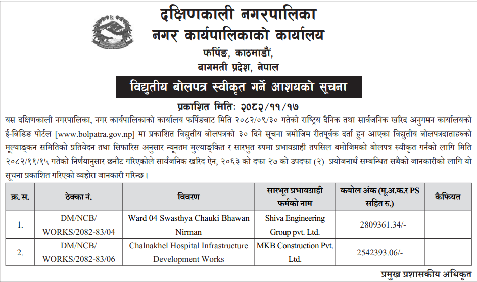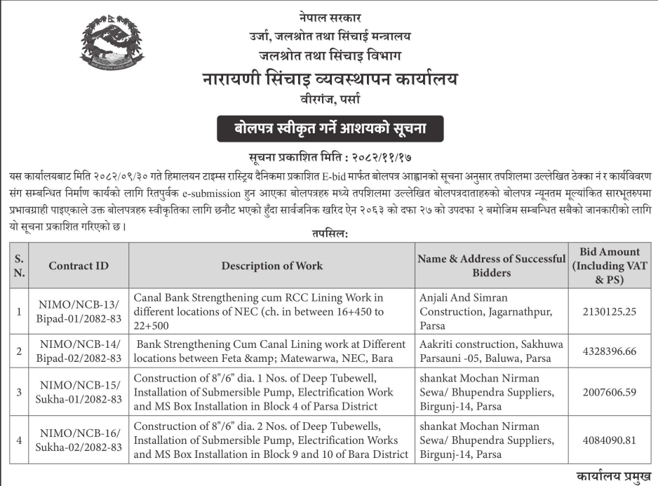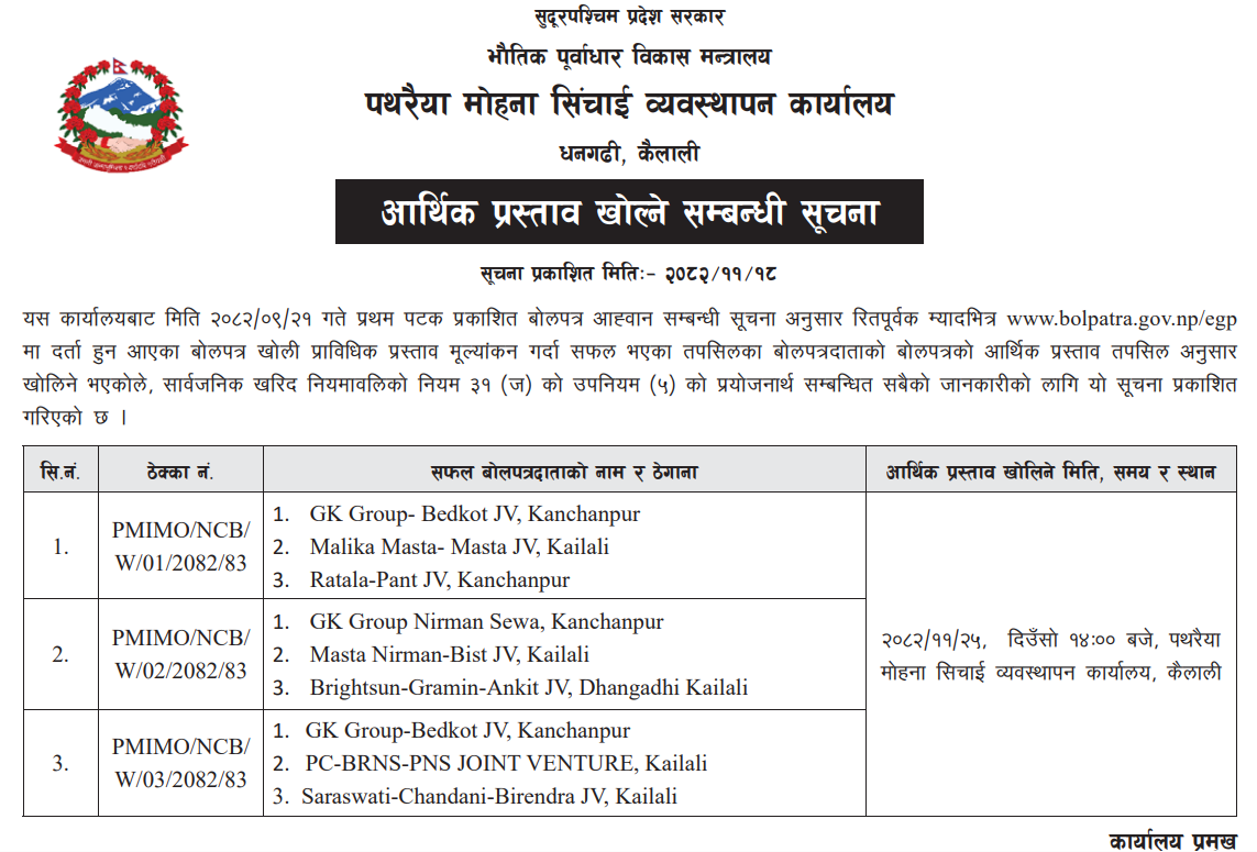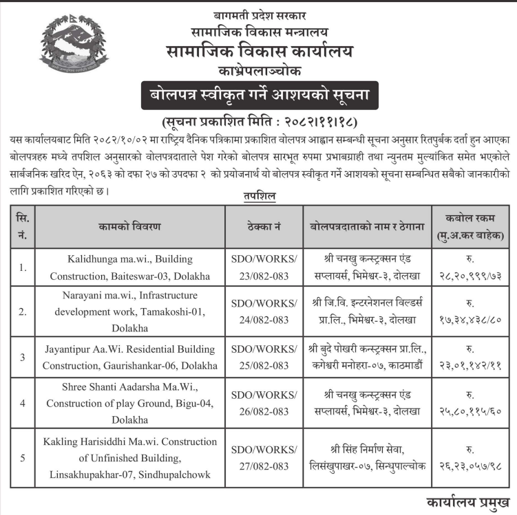 प्रदेश ३ मा प्रकाशित निर्माण सम्बन्धी बोलपत्र तथा आशयका सुचनाहरु