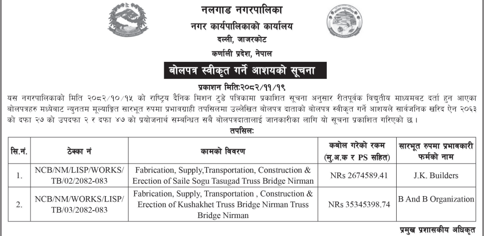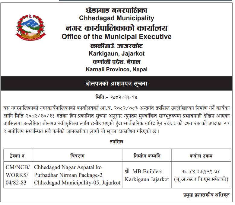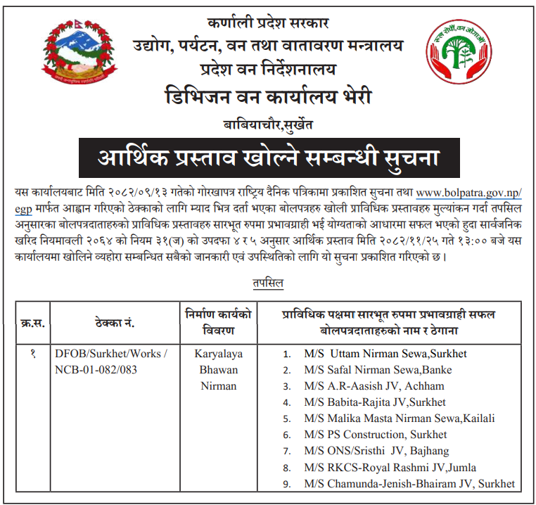 प्रदेश ६ मा प्रकाशित निर्माण सम्बन्धी बोलपत्र तथा आशयका सुचनाहरु