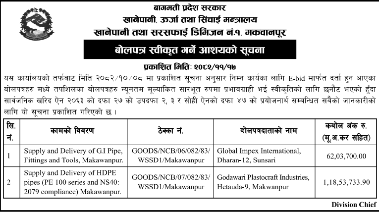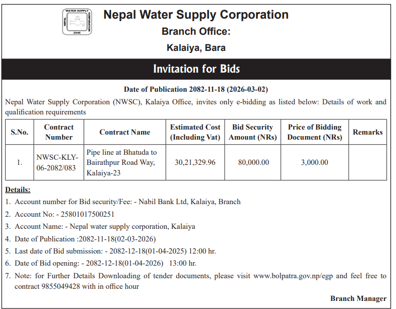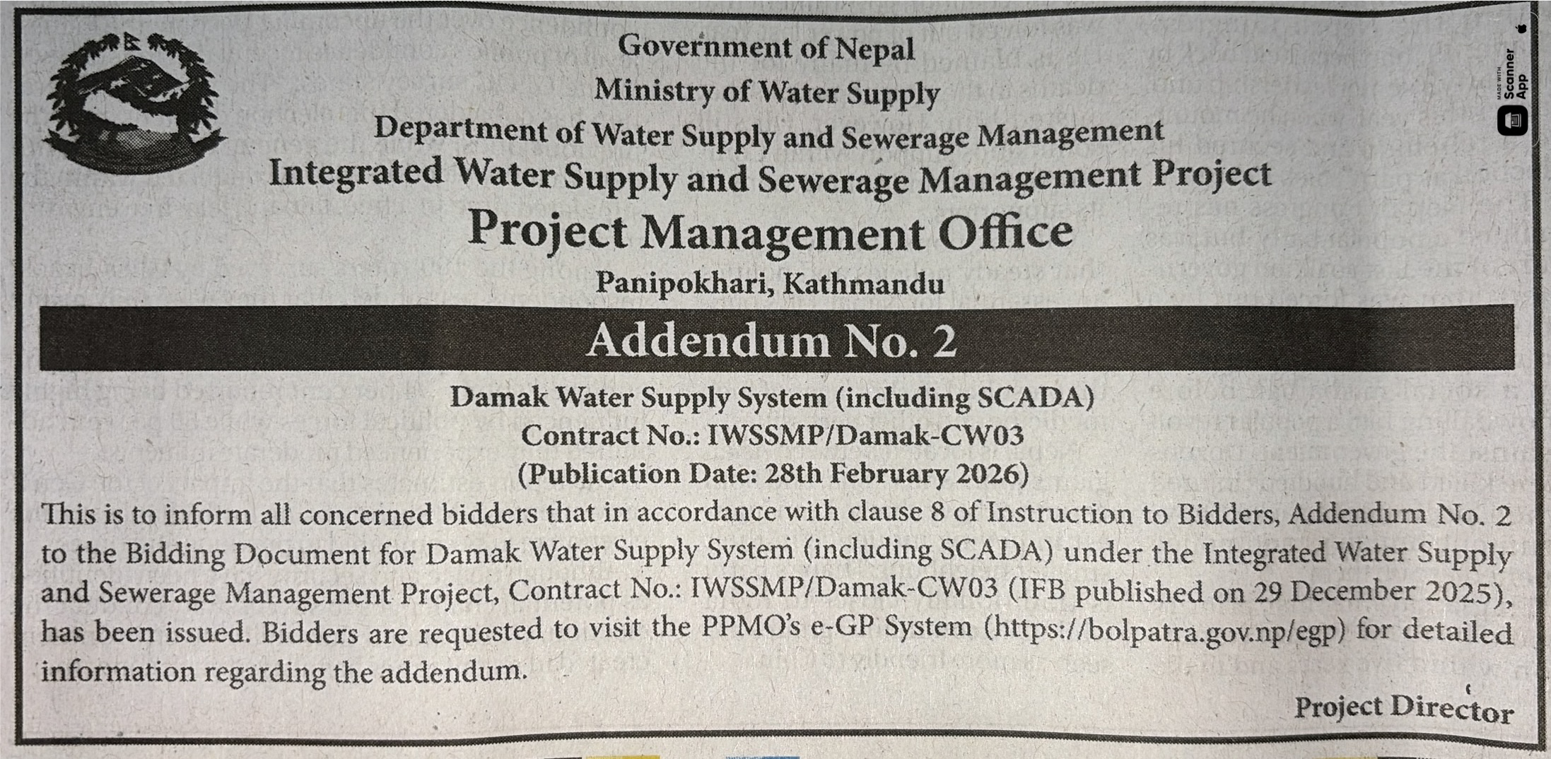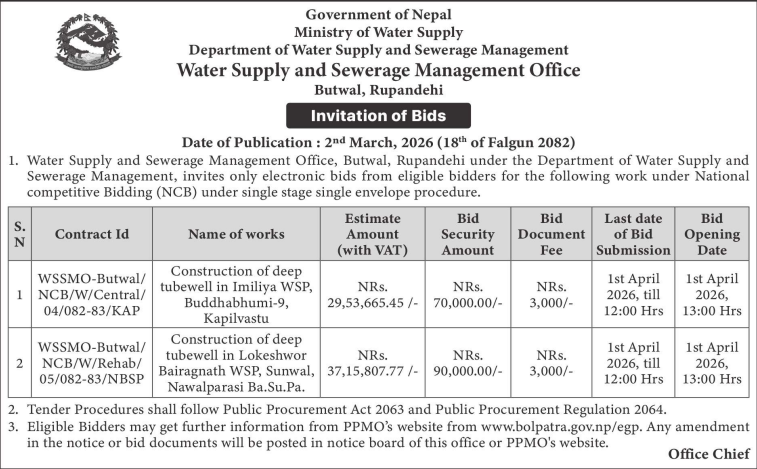 | 33 | Water Supply and Sewerage Management Office, Dadeldhura | Supply and Delivery of PE 100 HDPE pipe for different WS Projects of Dadeldhura, Doti & Achham District | 03/03/2026 | PPMO | 18/03/2026 | Click Here | |