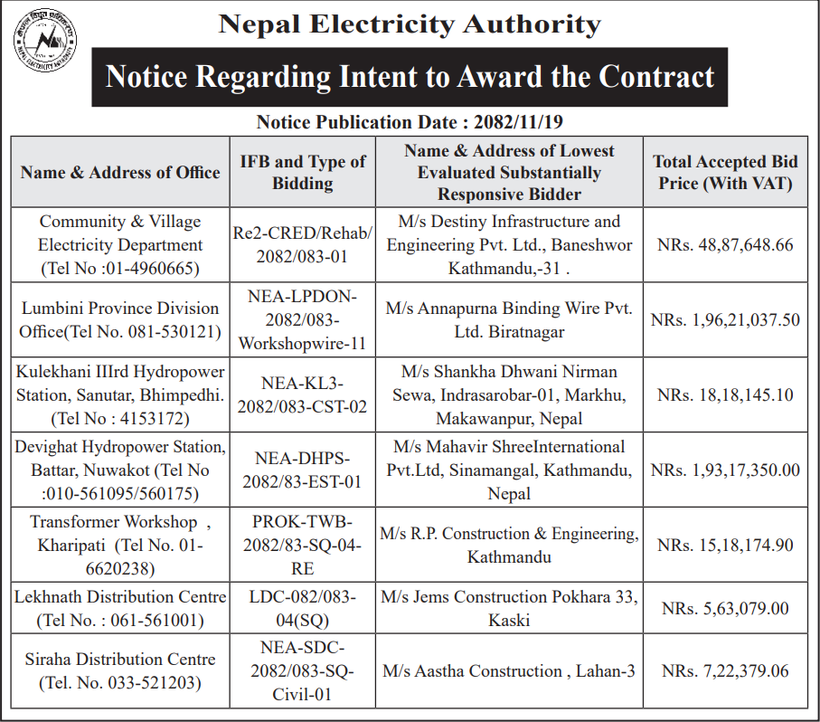 | 36 | NEA, Lekhnath Distribution Center | Supply and Delivery of Electrical Items at Lekhnath Distribution Center,Talchowk,Kaski | 03/03/2026 | PPMO | 18/03/2026 | Click Here | |