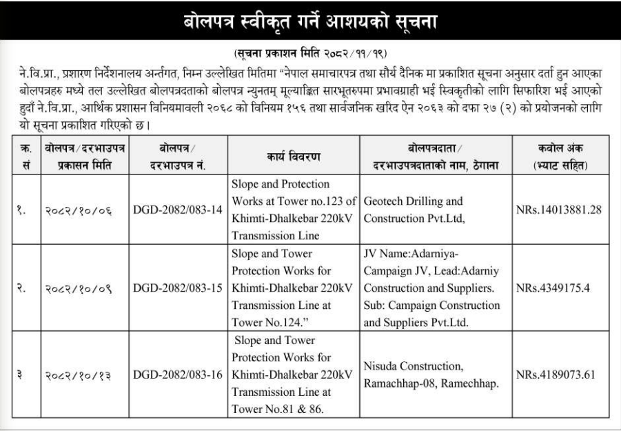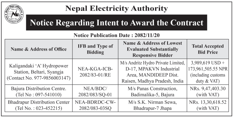 | 50 | NEA, Devighat Hydropower Station | Supply, Delivery, Installation, Testing & Commissioning of Outdoor 66KV SF6 Generator Synchronizing Circuit Breaker and 66kv Polymer Type Surge Arrester | 03/03/2026 | PPMO | 02/04/2026 | Click Here | |