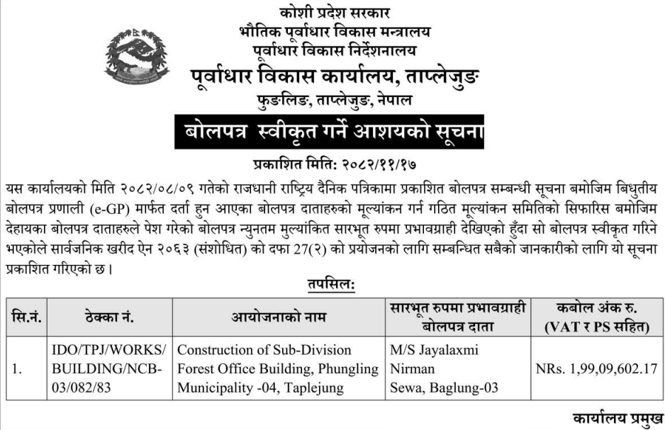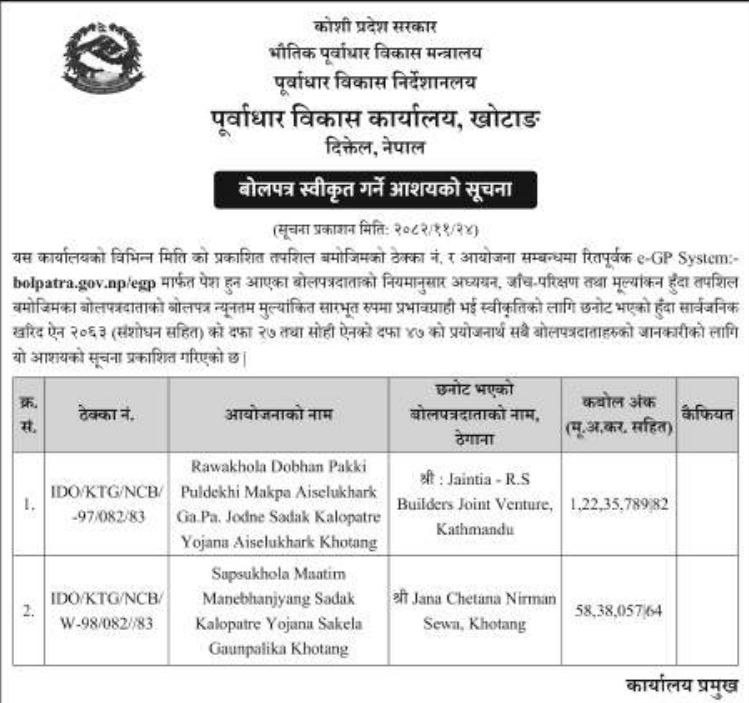 प्रदेश १ मा प्रकाशित निर्माण सम्बन्धी बोलपत्र तथा आशयका सुचनाहरु