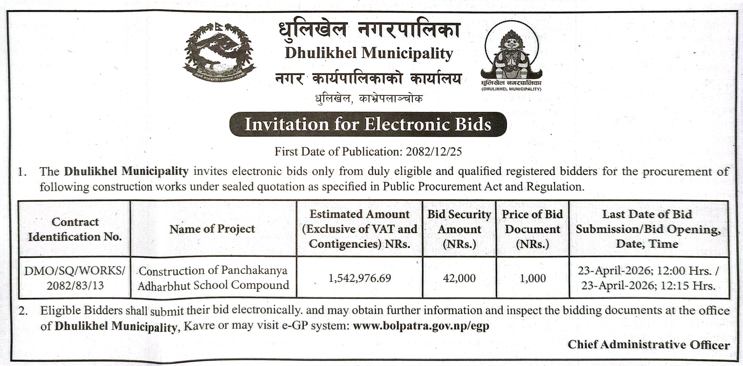 | 160 | Namobuddha Municipality | Supply and Delivery of Surgical Goods | 07/04/2026 | PPMO | 22/04/2026 | Click Here | |