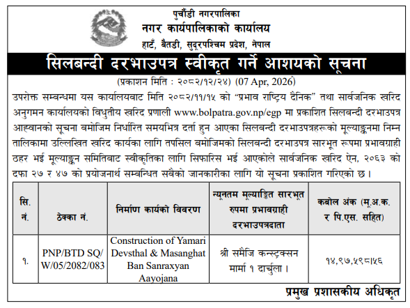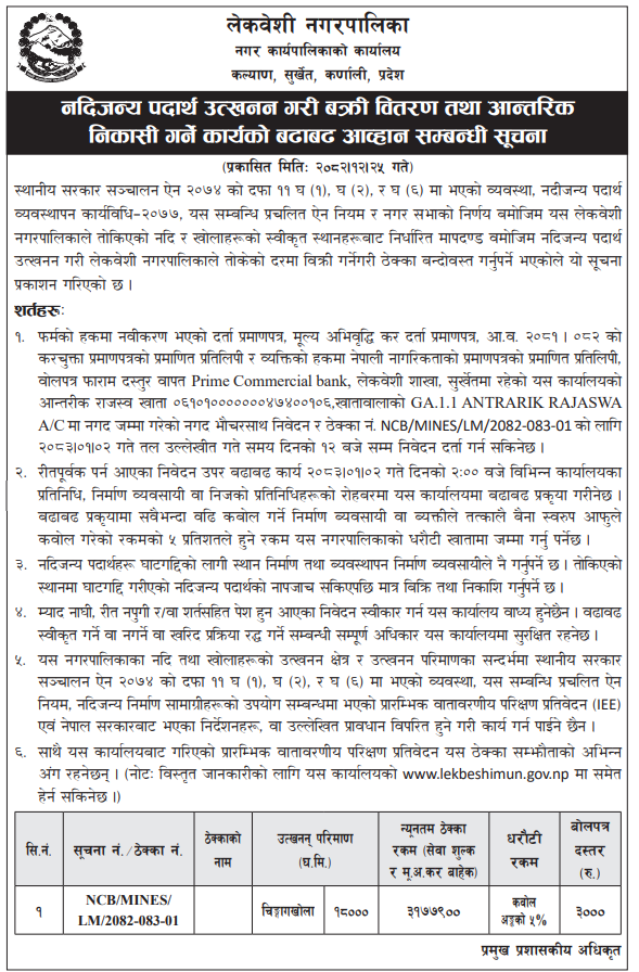 | 37 | Tulsipur Sub-Metropolitan City | Extraction, collection and sales of river bed material of babai at sukaura masanghat area | 07/04/2026 | PPMO | 22/04/2026 | Click Here | |