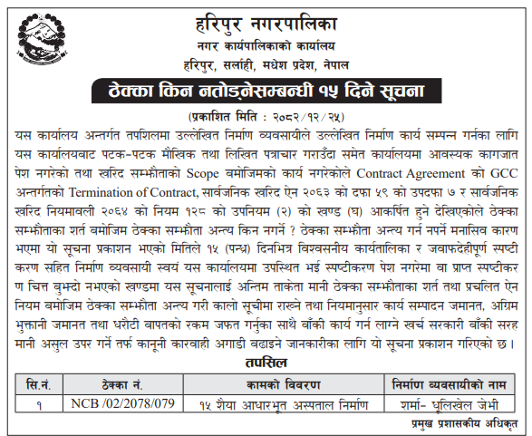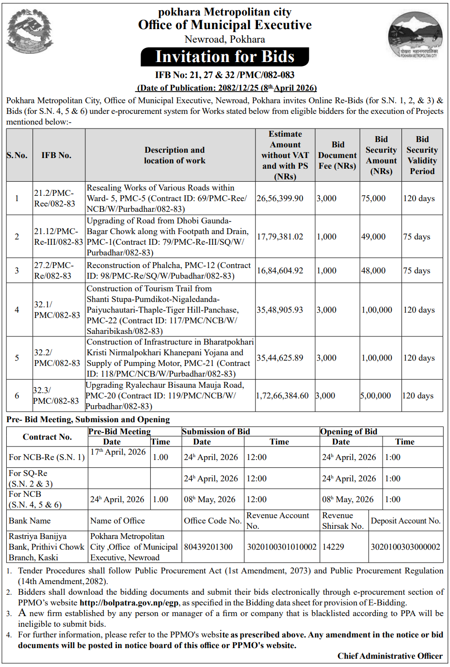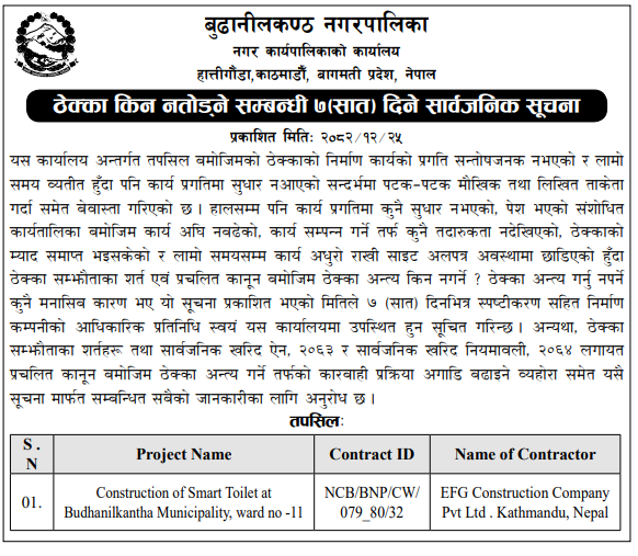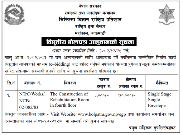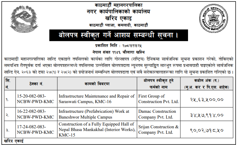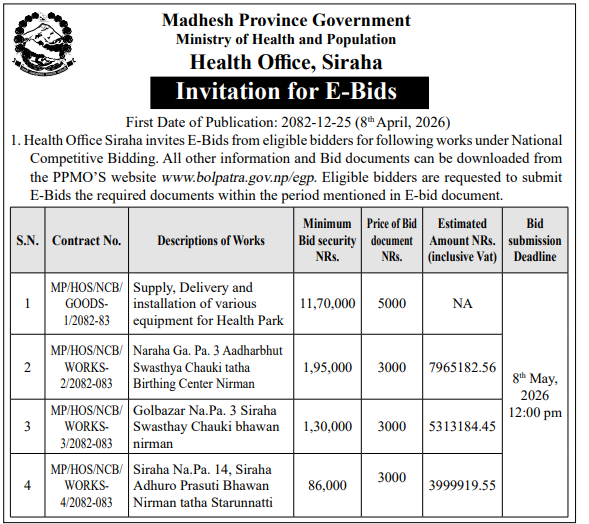 | 5 | Dakshinkali Municipality,Pharping Kathmandu | Shahari Swastha Kednra sudhrikaran | 07/04/2026 | PPMO | 22/04/2026 | Click Here | |