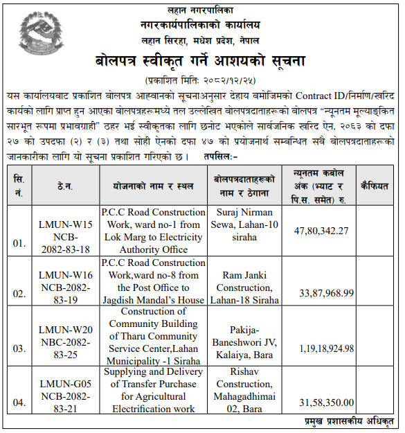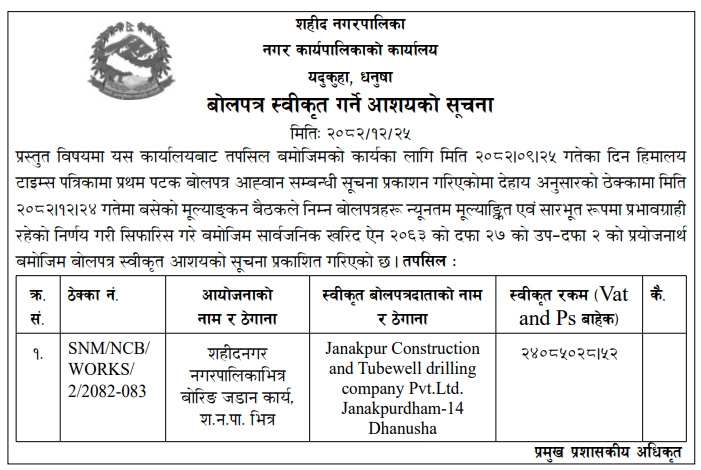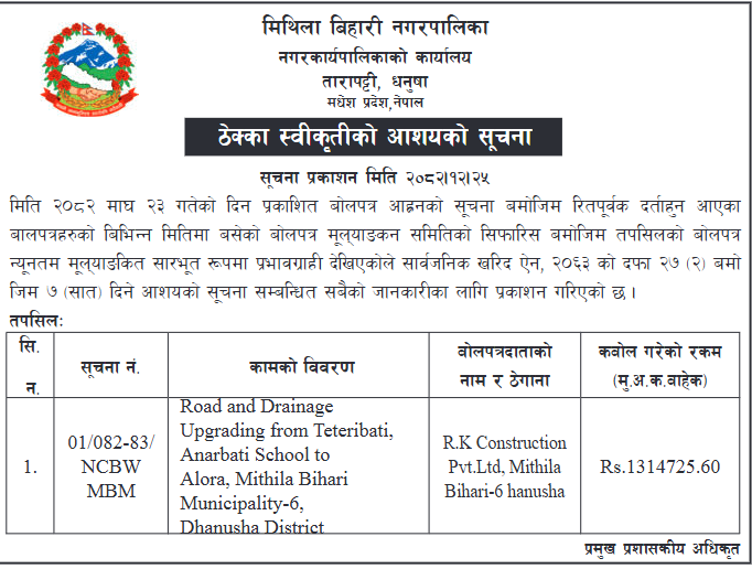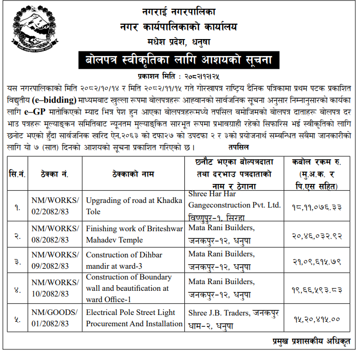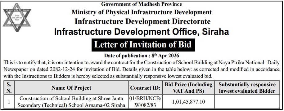 | 158 | Infrastructure Development Office, Dhanusha | Jilla Dhanusha Chhireshwarnath Na. Pa. Ward No-10 Sadak Istarunnati Karya | 07/04/2026 | PPMO | 07/05/2026 | Click Here | |