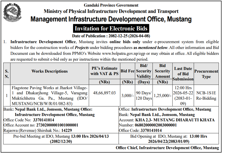 | 15 | Infrastructure Development Office (IDO) | Flagstone Paving Works at Jharkot Village-1 and Dhakarjhong Village-5, Varagung Muktichhetra Ga. Pa., Mustang | 07/04/2026 | PPMO | 22/04/2026 | Click Here | |