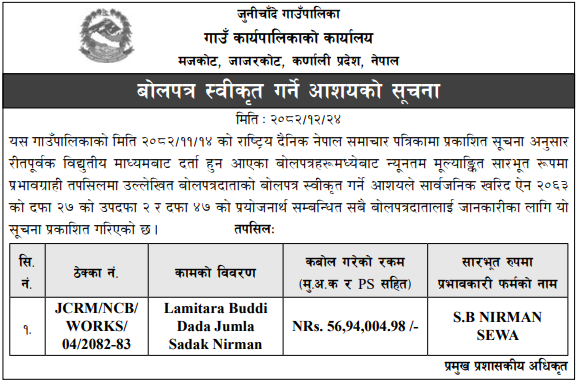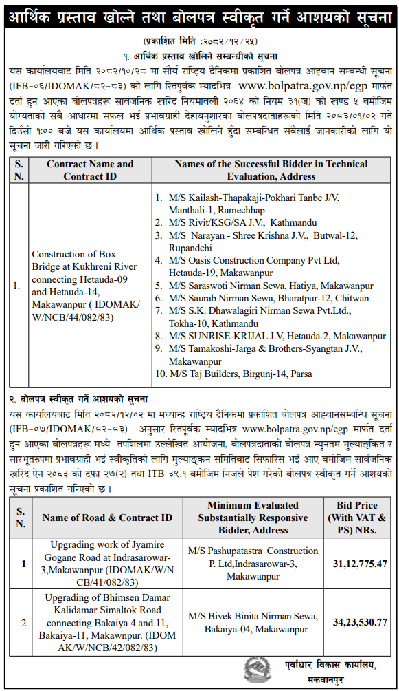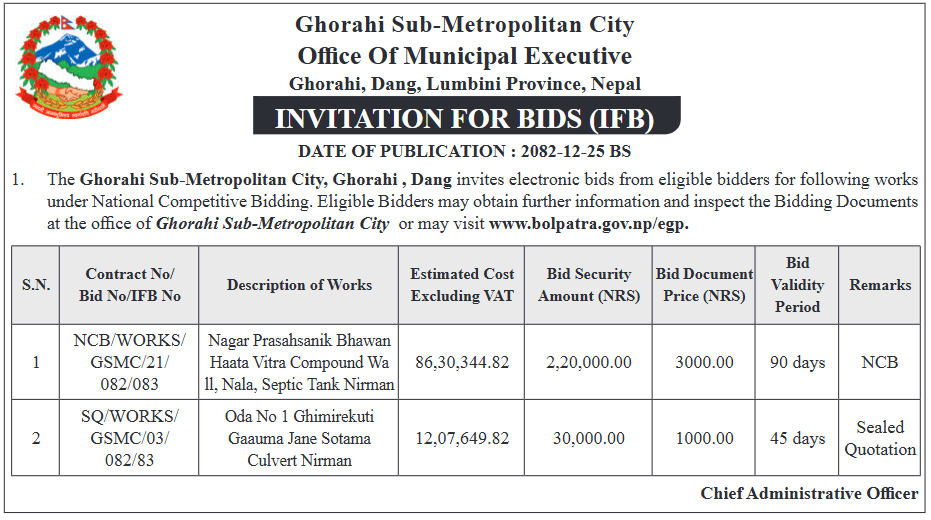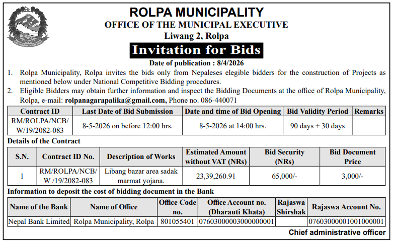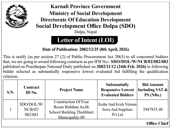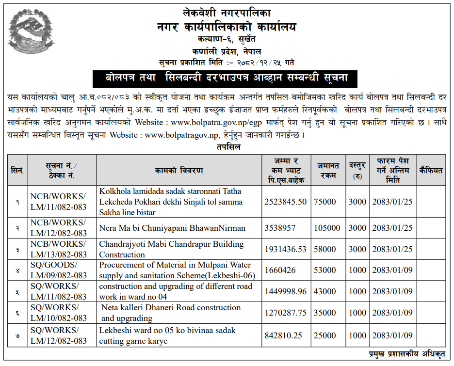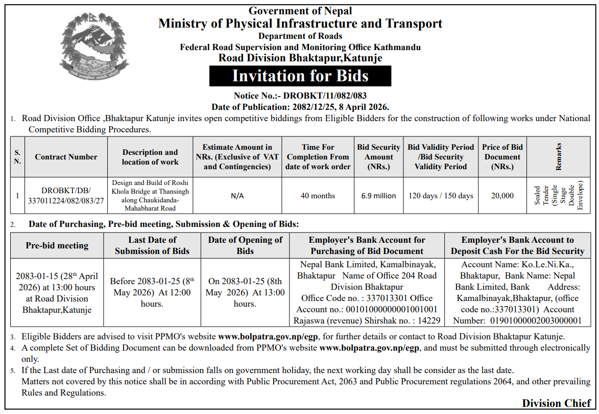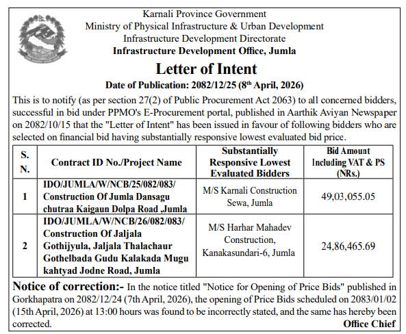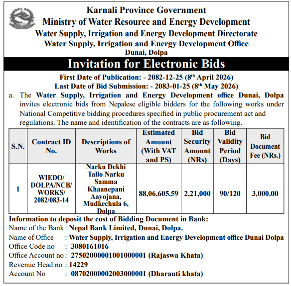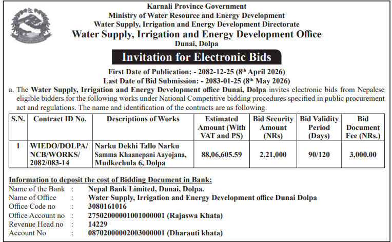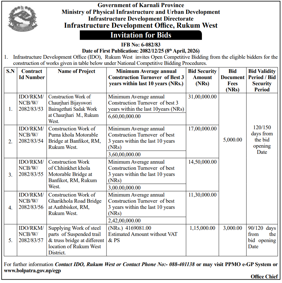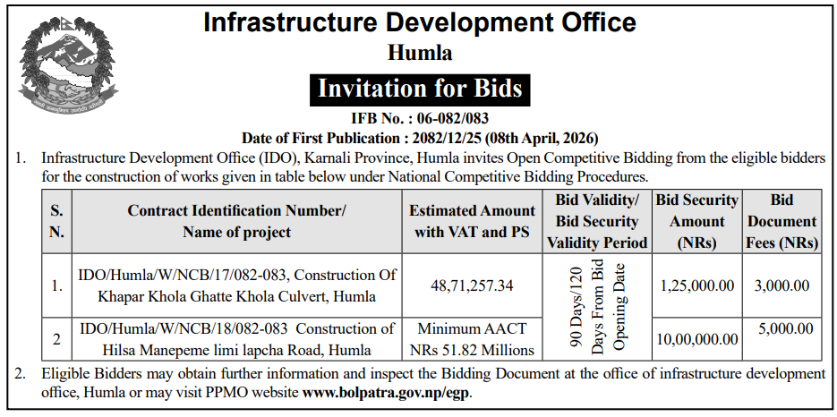 | 16 | Infrastructure Development Office, Jumla | Construction of Jumla Gachchesagu Jaljala Gothijyula Road, Jumla | 07/04/2026 | PPMO | 22/04/2026 | Click Here | |