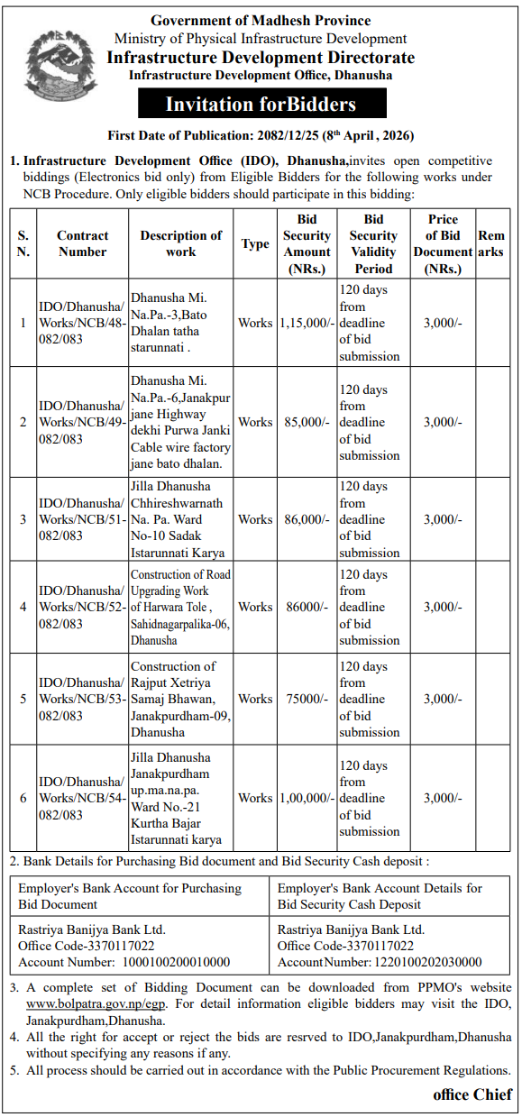 | 156 | Infrastructure Development Office, Dhanusha | Janakpur Jane highway dekhi purwa janki kewal wire factory jane bato dhalan , Dhanusha mithila na. pa.-6 | 07/04/2026 | PPMO | 07/05/2026 | Click Here | |