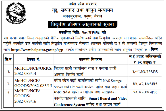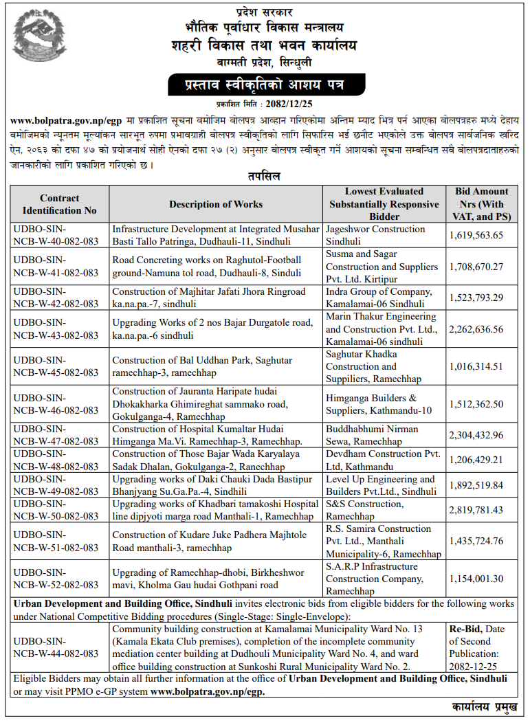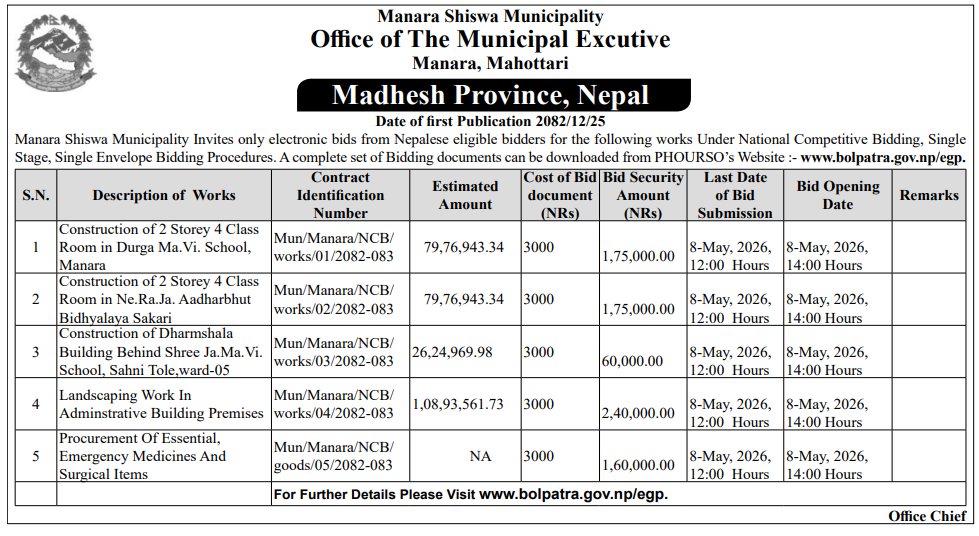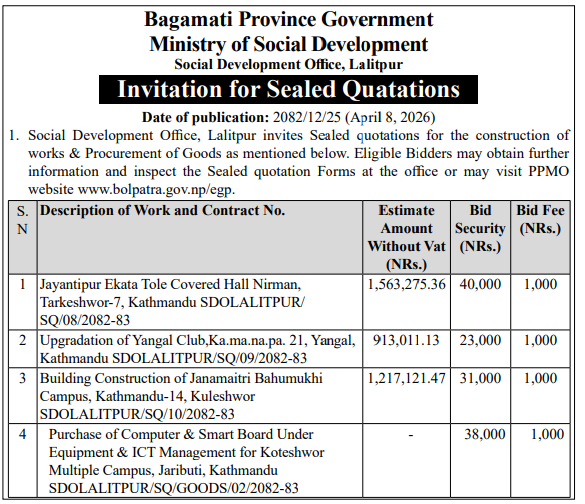 | 199 | Project Of Urban Development and Building Construction-Ramechhap,Manthali | Construction of RCC Frame Structure School Building of Nawajyoti Bahira Ma.Bi. Kamalamai , Netrakali Ma.Bi. Tamajor , Ratnaganga Ma.Bi. Fikkal and Chandeswori Ma.Bi. Daadi , Sindhuli | 07/04/2026 | PPMO | 07/05/2026 | Click Here | |
