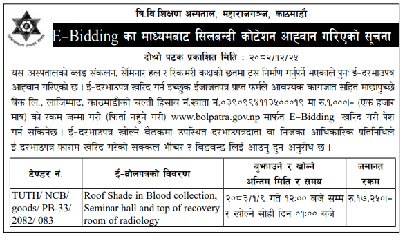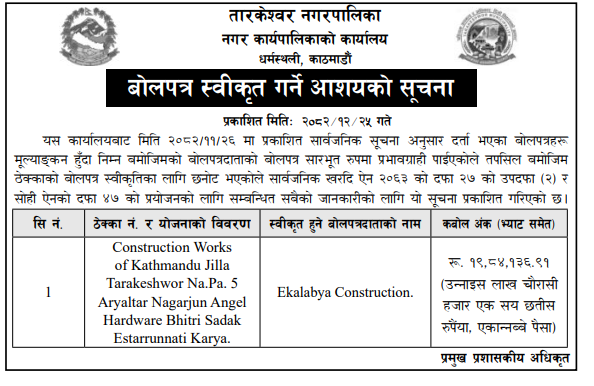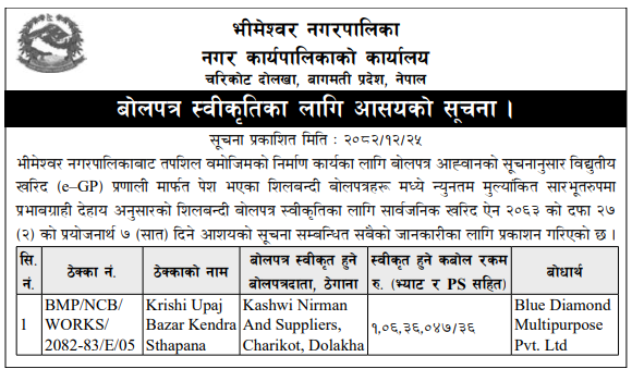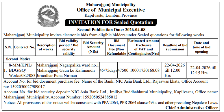 | 241 | Bharatpur Metropolitian City Office | Brahaman Susanskaar Sanaj Bhawan Nirmaan, BMC-19 | 07/04/2026 | PPMO | 22/04/2026 | Click Here | |