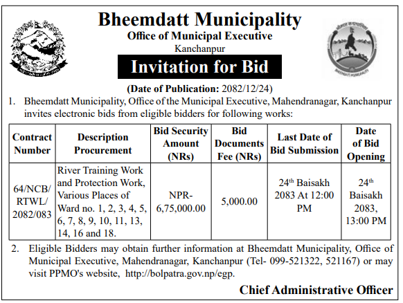 | 19 | Shantinagar Rural Municipality | Bagar kholako khadkapur ghat | 07/04/2026 | PPMO | 22/04/2026 | Click Here | |