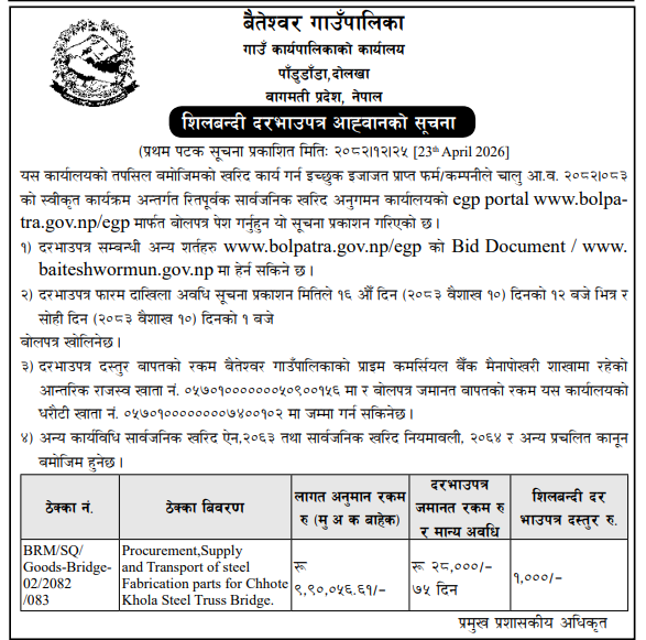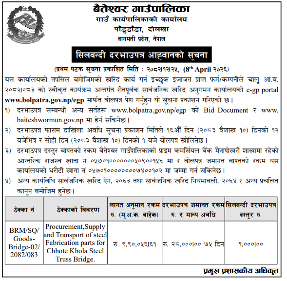 | 167 | Rapti Rural Minicipality, Dang | Febrigation and Supply of Steel Part of Lama khola Truss Bridge | 07/04/2026 | PPMO | 22/04/2026 | Click Here | |