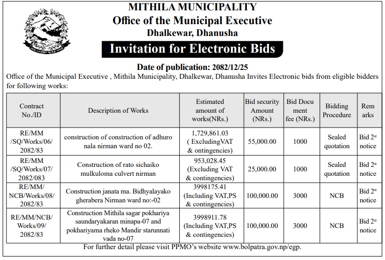 | 163 | Infrastructure Development Office, Dhanusha | Construction of Rajput Xetriya Samaj Bhawan , Janakpurdham-09, Dhanusha | 07/04/2026 | PPMO | 07/05/2026 | Click Here | |