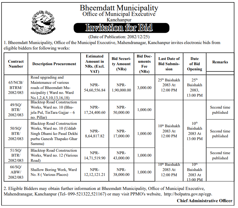 | 238 | Bedkot Municipality, Kanchanpur | Construction of Blacktop road at Ghatal school dekhi purba bohara ko ghar bata bhitra jane bato, Construction of Gokulpur culvert najik wall nirman, Lal bdr ko ghar najik Tatbanda ra Wall nirman, Gravelling Works at different sections of ward 7, Bedkot-07, kanchanpur | 07/04/2026 | PPMO | 22/04/2026 | Click Here | |