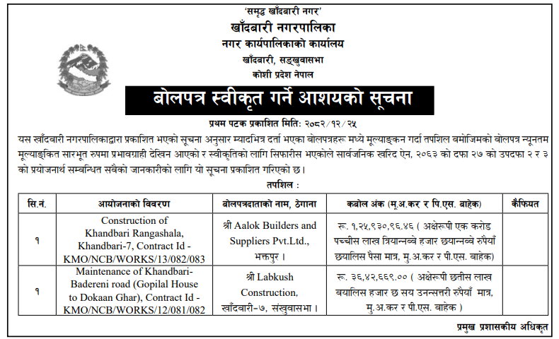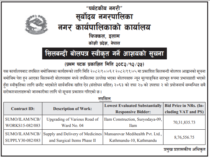 | 205 | Siddhicharan Municipality, Okhaldhunga | Okhaldhunga jilla Siddhicharan na.pa. Wada na.3 Adheri Narayansthan Barbote Adheri Baniyachhap Sadak Storunati | 07/04/2026 | PPMO | 07/05/2026 | Click Here | |