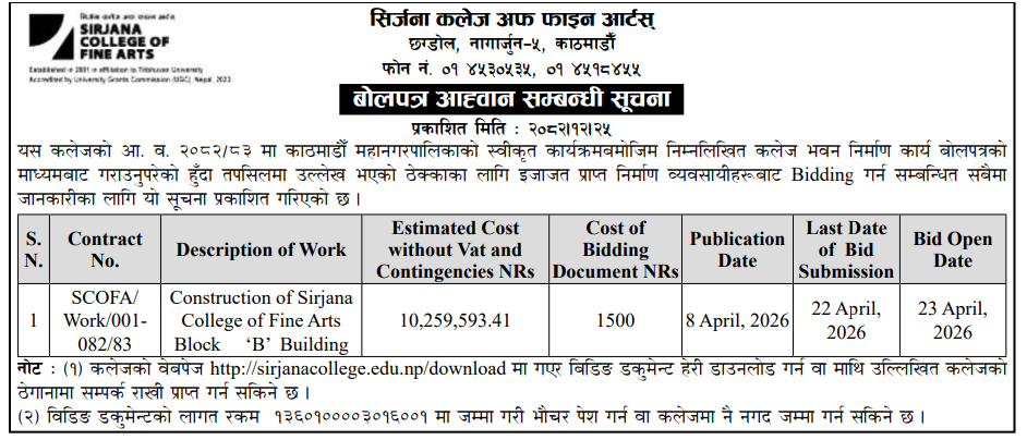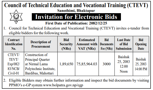| 231 | Nepal En gineering Council | Construction of Emergency Staircase & Allied Works at Nepal Engineering Council Permises, NEC (Contract ID: 2/NEC-RE/NCB/W/082-83) | 07/04/2026 | PPMO | 22/04/2026 | Click Here | |