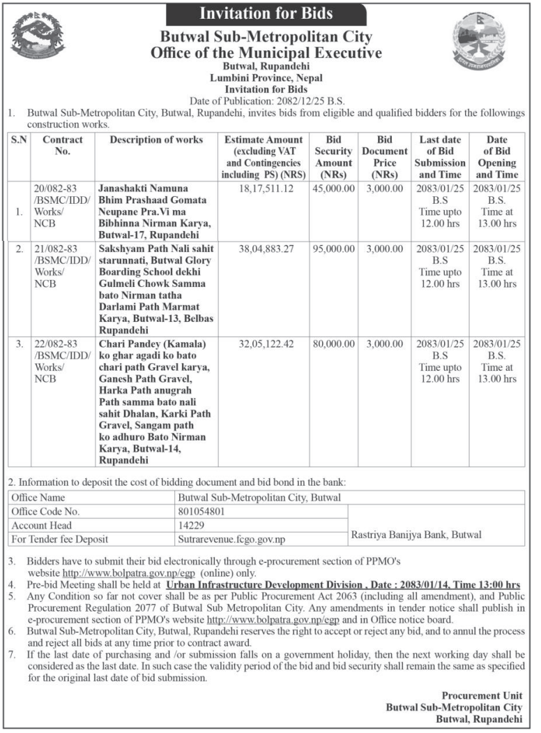 | 243 | Bharatpur Metropolitian City Office | Construction of Gravel Road at Different Road Section of BMC-20 (Section-1) | 07/04/2026 | PPMO | 22/04/2026 | Click Here | |