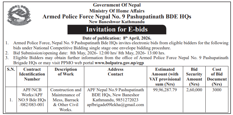 | 8 | Infrastructure Development Office , Jhapa | Kabristan Gherawara tatha Sauchalaya Nirman, Barhadashi-5, Jhapa (Rebid) | 07/04/2026 | PPMO | 22/04/2026 | Click Here | |
