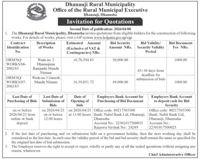 | 166 | Infrastructure Development Office, Dhanusha | Jilla Dhanusha Janakpurdham up.ma.na.pa. Ward No.-21 Kurtha Bajar Istarunnati karya | 07/04/2026 | PPMO | 07/05/2026 | Click Here | |