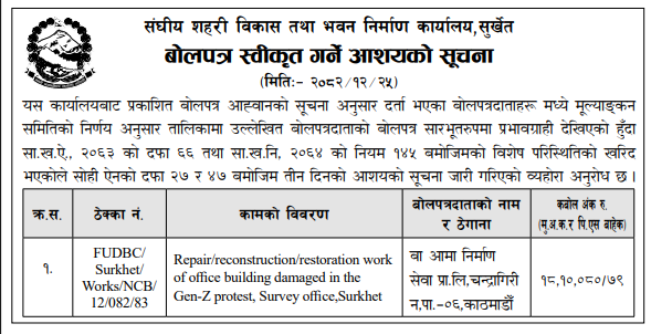 प्रदेश ७ मा प्रकाशित निर्माण सम्बन्धी बोलपत्र तथा आशयका सुचनाहरु