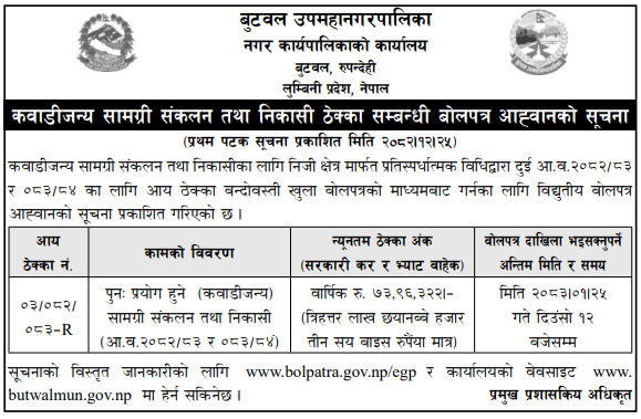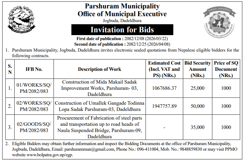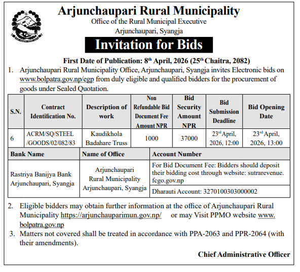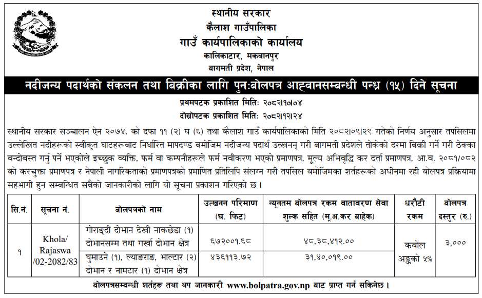 | 26 | Kailash Rural Municipality, Makawanpur | The Extraction, collection and Disposal of River based materials from a designated area of River. | 07/04/2026 | PPMO | 22/04/2026 | Click Here | |