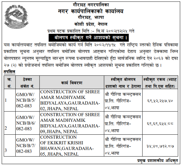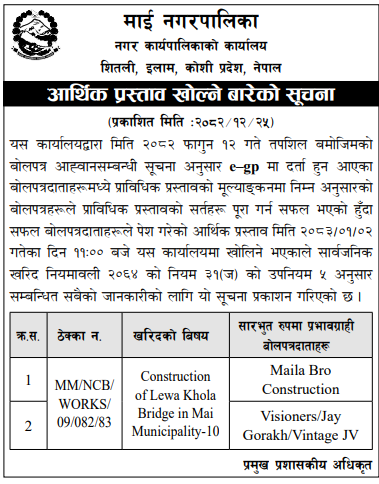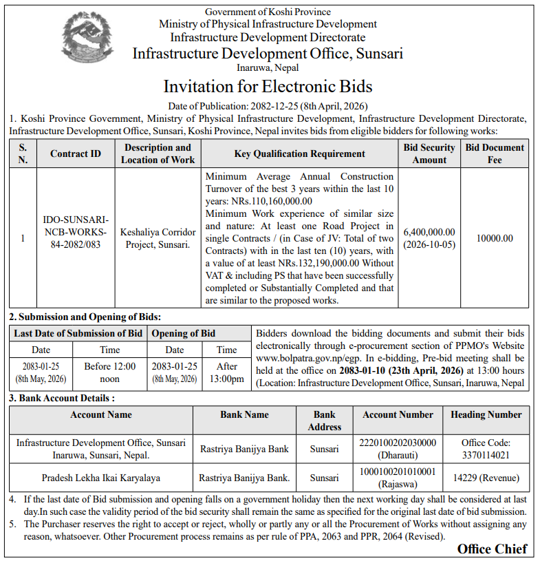 | 12 | Infrastructure Development Office , Jhapa | Kamalbadi sadak Kishor Bhattarai ghar dakhrin Bi Ne -03, Jhapa | 07/04/2026 | PPMO | 22/04/2026 | Click Here | |