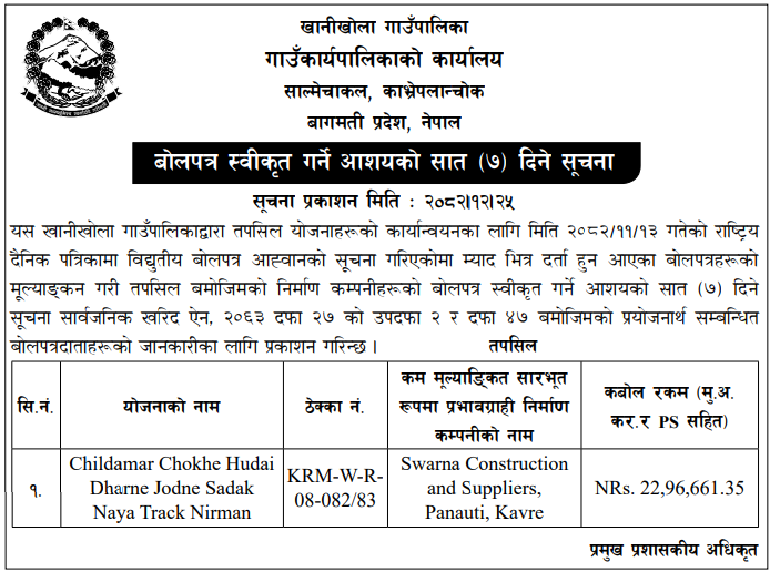 | 204 | Tripurasundari Rural Municipality Office, Dhading | Prahari Chauki Dekhi Kami Gaun Samma Sadak Starunnati, Tripurasundari-2, Dhading | 07/04/2026 | PPMO | 07/05/2026 | Click Here | |