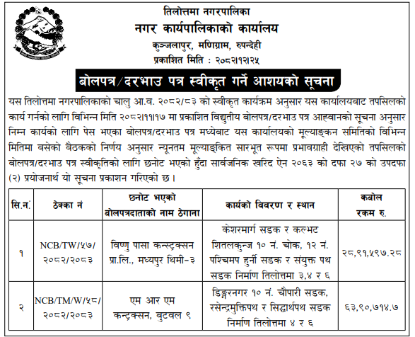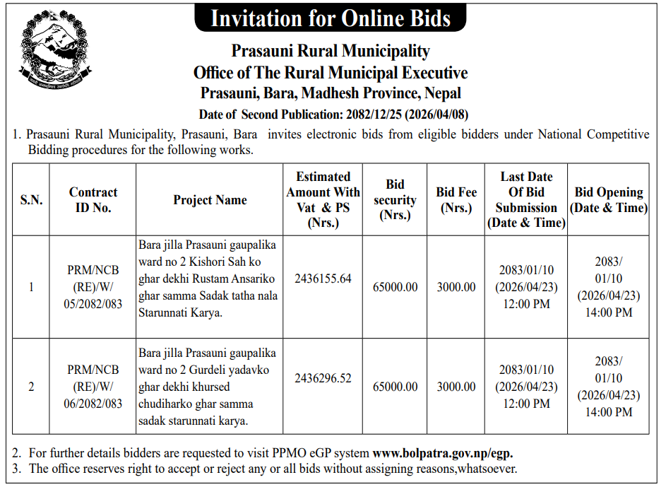 | 25 | Jeetpursimara Sub metropolitan city | Construction Of Road From Binod Neupane's House Upto way to West JSMC 2 | 07/04/2026 | PPMO | 22/04/2026 | Click Here | |