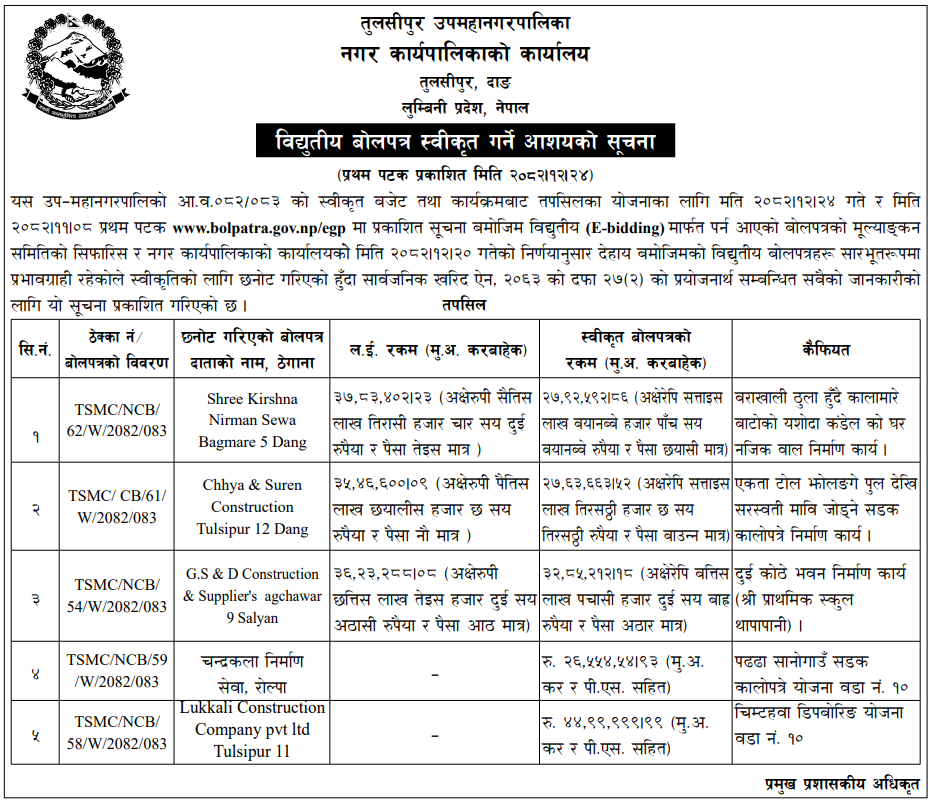 | 38 | Tulsipur Sub-Metropolitan City | Extraction, collection and sales of river bed material of babai at gwarkhola bayokhola area | 07/04/2026 | PPMO | 22/04/2026 | Click Here | |
