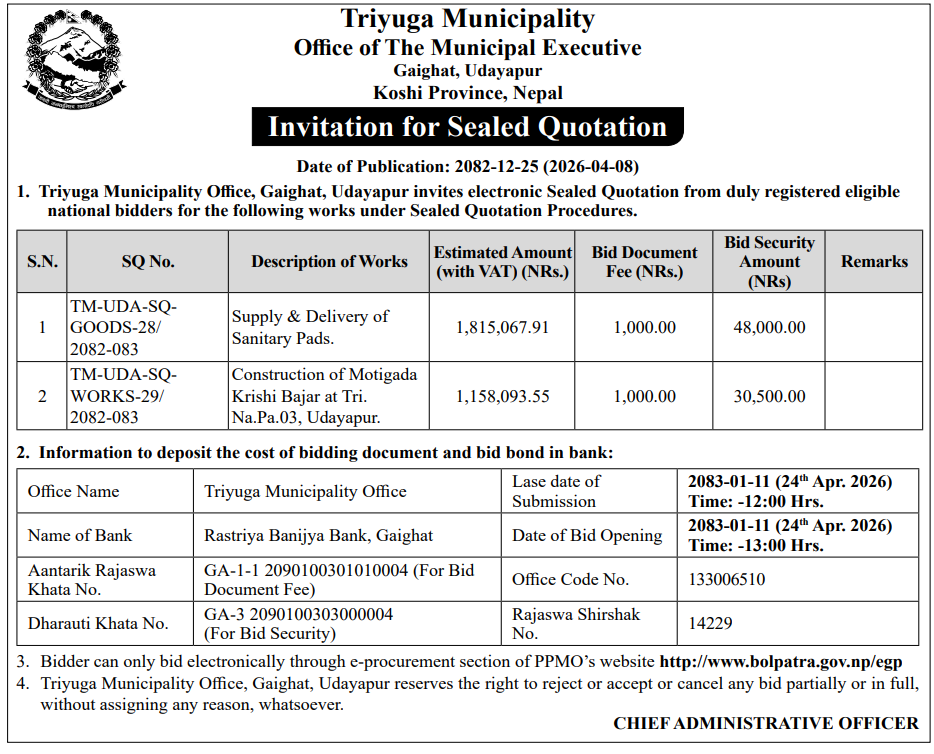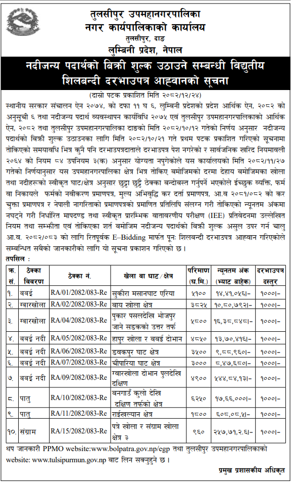 | 39 | Tulsipur Sub-Metropolitan City | Extraction, collection and sales of river bed material of gwarkhola pukar pasal dekhi bhojpur jane sadak ko pul dekhi uttar tarfa ko area | 07/04/2026 | PPMO | 22/04/2026 | Click Here | |