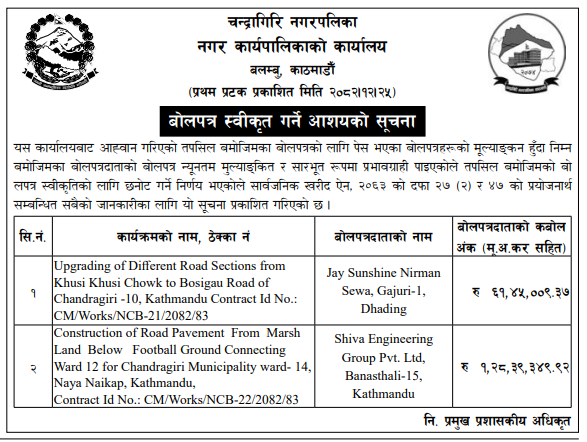 - Award Notice : Road Upgrading Work At Various Places (Swornikita Construction and Suppliers, Gatishil-Gravity JV) |