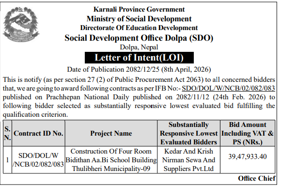 | 3 | Shree Bhairab Secondary School,Khor Dailekh | Construction of Toilet & Sanitary Works in Bhairab Secondary School Khor,Dailekh | 07/04/2026 | PPMO | 22/04/2026 | Click Here | |