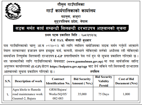 | 1 | Barahatal Rural Municipality, Surkhet | Road Construction and maintenance works in ward no 06 & 07 | 07/04/2026 | PPMO | 22/04/2026 | Click Here | |