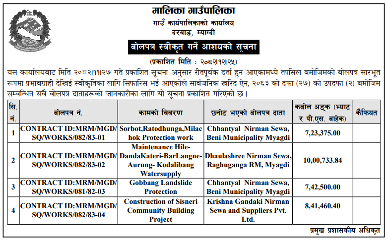 | 188 | Integrated Service Office, Mustang | Construction of Tourism Infrastructure at Dhaulagiri Ice Falls, Thasang Ga. Pa. | 07/04/2026 | PPMO | 07/05/2026 | Click Here | |